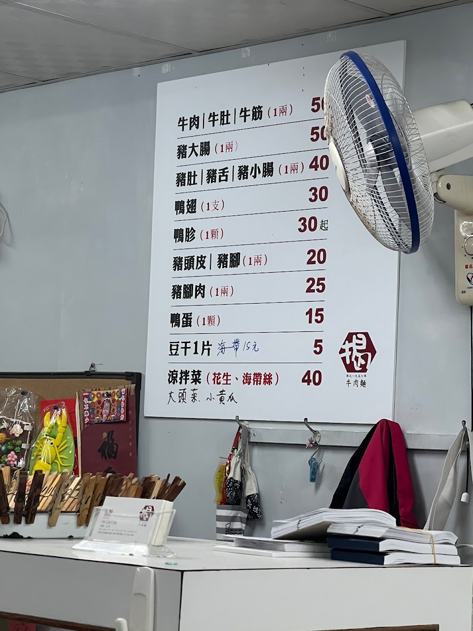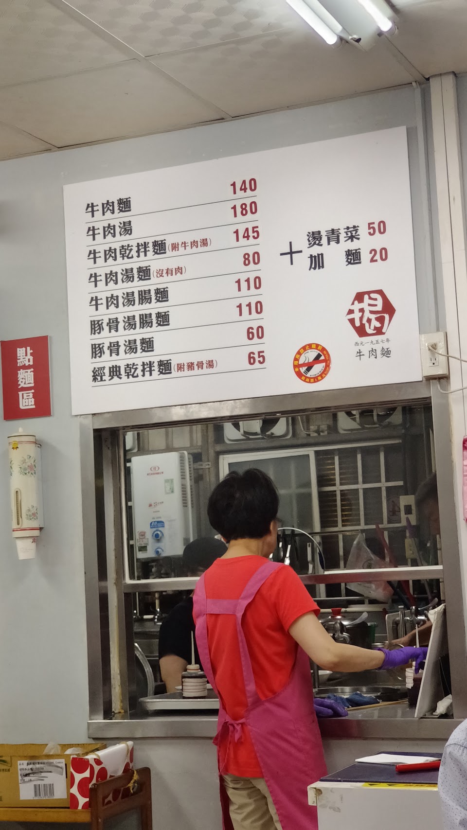 牛肉麵$140不會辣口味可以接受,小孩愛吃麵,+20加麵後的量跟一般麵量差不多,古早味陽春乾麵$65附一碗溫度不足的豬高湯,口味可以但價格有點高。小菜更是價格偏高,雖然有以兩計價的價格告示牌,但是拿取時不知道多重,(看到前一位伯伯小菜600嚇到)於是用小盤子只拿一點點試味道,並先詢問價格,阿姨頭也不抬只告知待會會秤重計價,小菜沒有再加熱或涮過滷汁是乾冷硬不合口味,然後不知道是不是要視覺效果才會分兩盤。大熱天中午用餐只有電風扇……最後結帳總共455…(海帶豆乾滷蛋各一個、大腸小腸牛筋各一小塊,小菜共230!)