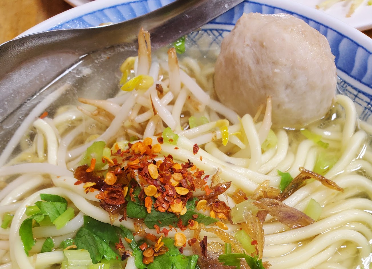 炊粉配上那個醬(油?)好吃,就是醬太少了,沒法通通拌到,後來加了店裡有點甜味的辣椒醬,也挺不錯的。 粉沯的顏色是深咖啡色,比明和麵店、戽斗滷肉飯買的顏色深,口感類似戽斗,沾醬也是不錯,我覺得好吃。 貢丸湯,湯頭很讚,就是芹菜珠珠加太多,純喝湯還要咀嚼菜末,有點討厭;貢丸看起來挺大顆,口感不是很紮實的,有Q彈,但是沒那麼會吸汁。 店內的阿姨們還挺隨和的。