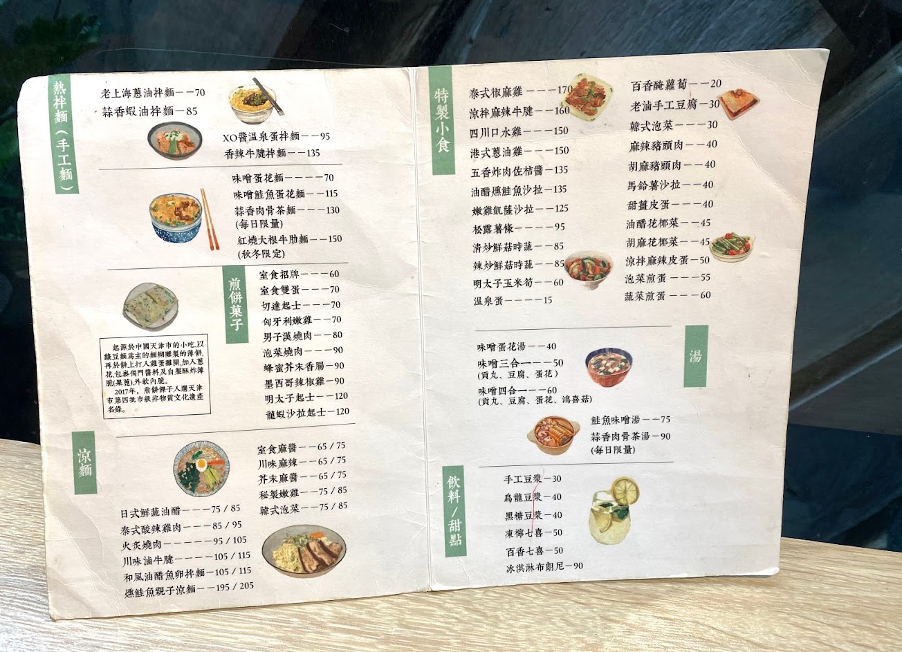 煎餅很好吃(推)涼麵的口感很像日式冷麵 也很精緻,口水雞肉質很嫩 醬料麻而不辣,喜歡店內的氛圍,環境很乾淨,服務員很親切,但個人建議水杯可以換有質感一點的 上面已經有出現很多刮痕了 會讓杯子看起來霧霧的 !!