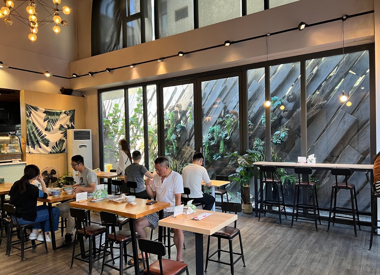 時尚簡約的餐廳,提供麵食、湯品,以及鮮蝦沙拉和肉骨茶。
