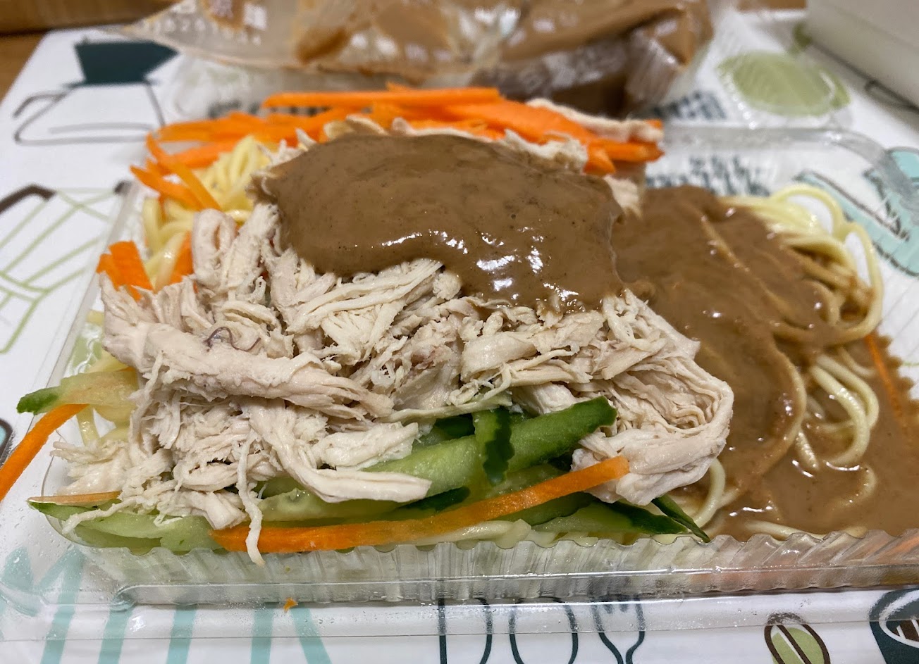雞絲新鮮 量多,小黃瓜絲+紅蘿蔔絲、油黃麵,搭配麻辣醬包,真的很好吃。