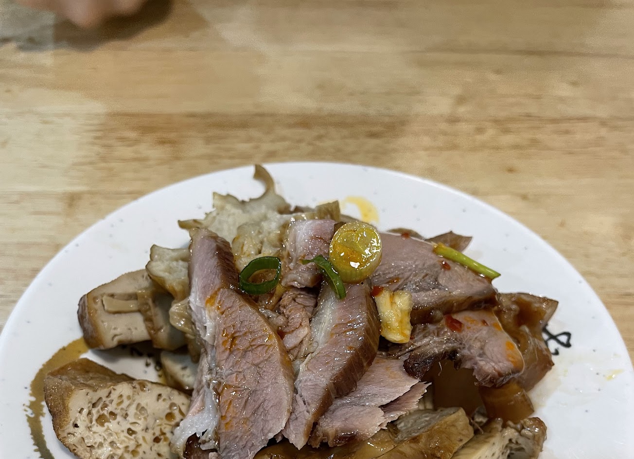 燒餅可能是因為回烤,硬脆又有韌性,滿耐嚼,可以磨牙。牛肉薄,有點嚼感,白菜絲脆,湯頭牛味濃,滿好吃。滷味溼潤,充滿滷汁,豆干、麵腸、油豆腐都軟嫩,肉薄片剛剛好軟,滿不錯。