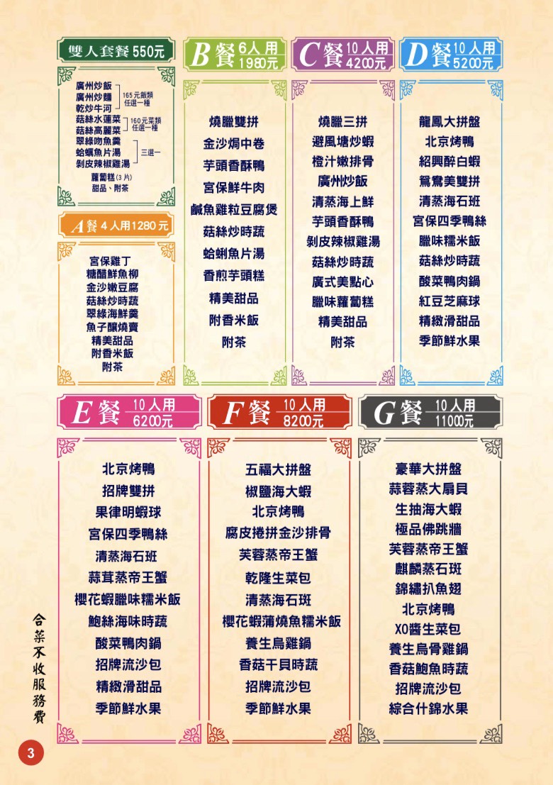 餐廳位於大菜市附近,經國路南下方向看到了文華派出所、麥當勞路口右轉前300公尺,並備有免費特約停車埸,於拉亞漢堡右側大樓空地,先到先停。適合多人聚會或聚餐。除夕到初六過年期間合菜,價位6000及8800元兩種,8800元的菜色,嫩油雞大塊和草蝦也很大尾,份量來說都有給足,荷葉鰻魚糯米飯及蜜汁豬肋排肉質軟嫩容易去骨好吃,湯品類味噌鮭魚鍋有點鹹,招牌廣式美點心很普通。春節期間上菜速度有點慢,生意非常好,附設無限量供應飲茶。櫃台主管及送菜人員客氣會親切噓寒問暖,令人愉悅。