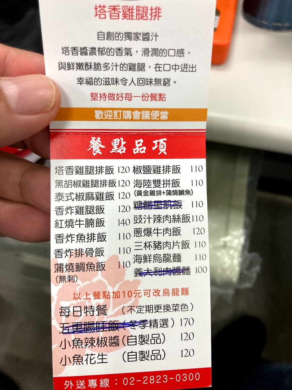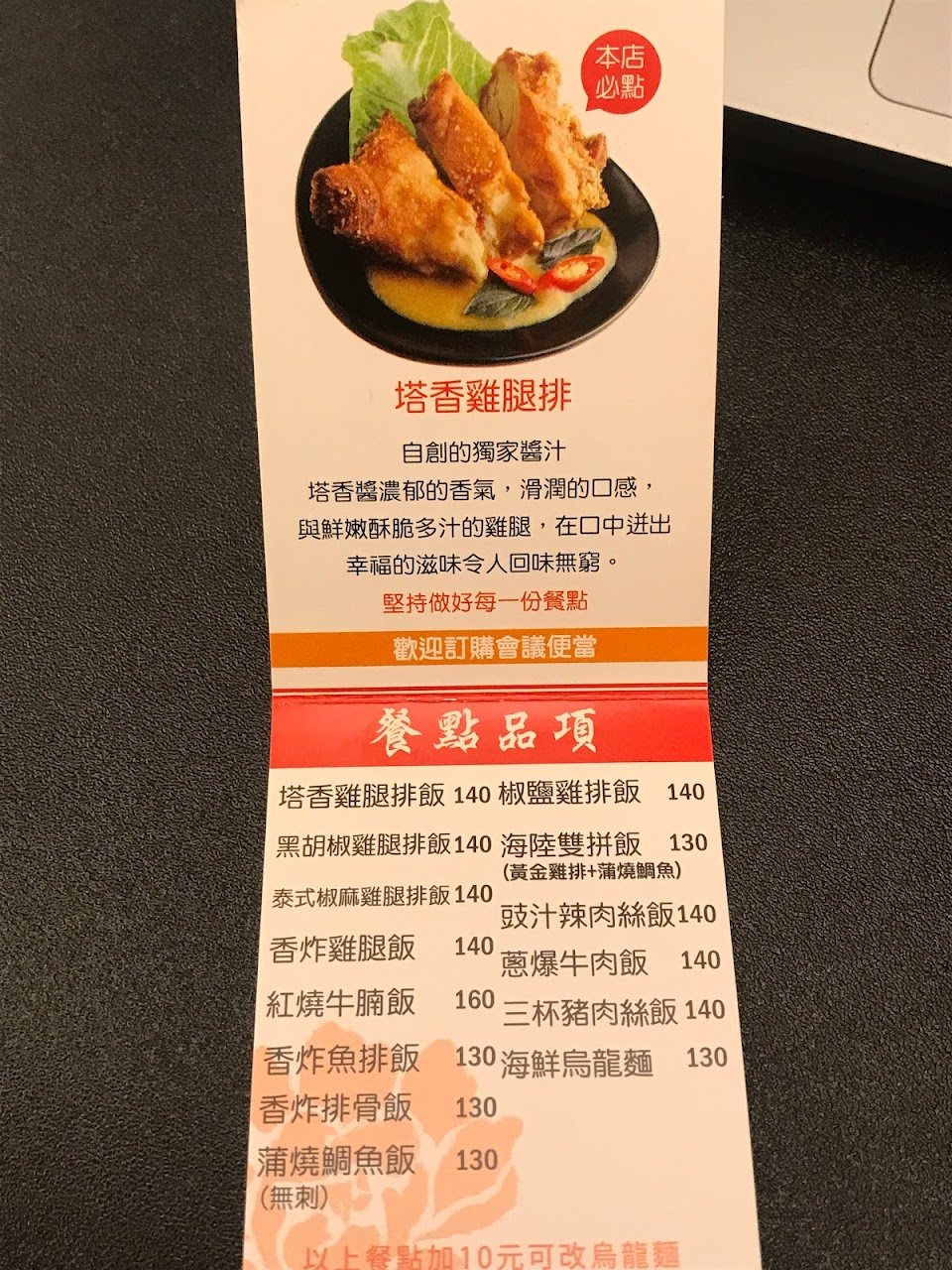 塔香雞腿排味道不錯,配菜也不錯,難得便當菜能吃到軟嫩的豆干跟茭白筍,只是價格120元,真的有點貴,偶爾吃還可以。
