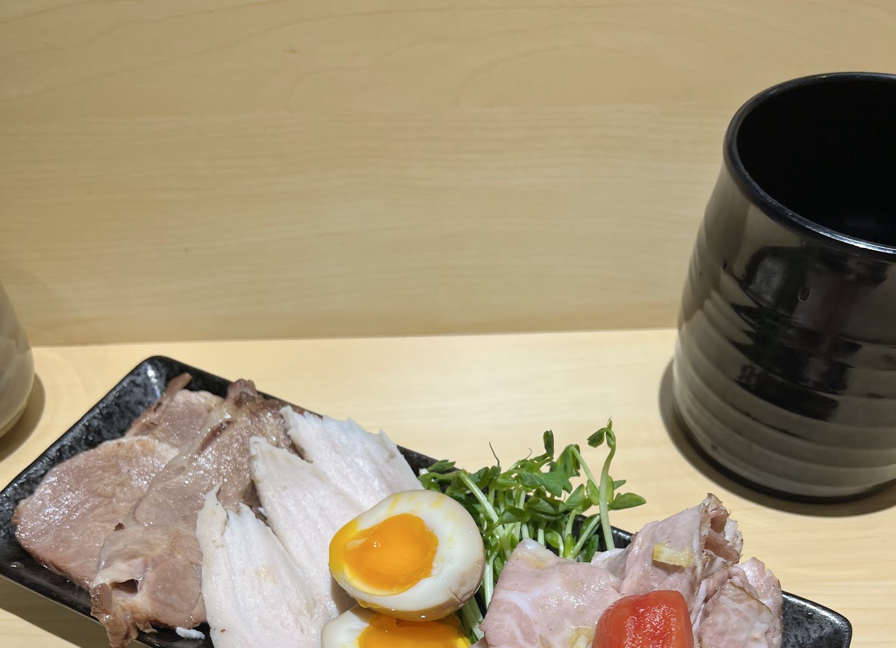 過來就是叉燒盤, 上面有3種肉、溏心蛋、醃製小番茄、苜蓿芽 第一種比較粉色粉嫩的酸爽嫩、 第二種偏白像舒肥的雞胸厚度剛好、口感帶嫩 第三種外型像傳統叉燒,肉感較重有炙燒香 溏心蛋是會流心的那種。 光這盤肉我覺得就快回本, 拉麵裡面有像差餛飩的薄脆口感、 內餡吃不出是什麼增加口感 還有一隻剝殼的大蝦 整體輪流搭配,湯喝完不膩 我是男生我吃不完,但湯跟麵完食很撐