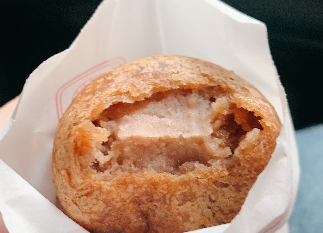 芋泥球一顆和我的拳頭一樣大,內餡滿滿芋泥真的超棒的!趁熱吃最棒,買回家隔日吃也可以切開後進烤箱,依舊很讚!