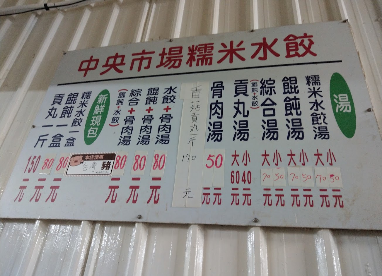 藏身在新竹中央市場裡面的一間糯米水餃店, 店面看起來不怎樣, 但門庭若市超級超級有名。 賣的品項非常簡單, 就是照片裡面看到的那幾項, 有水餃有餛飩配上大骨湯或是清湯, 如果需要的話可以加上當地最知名的丸子, 如此簡單的菜色卻吸引大家來吃, 真的是因為他實在太好吃了。 照片看起來普普通通不過就是一碗水餃, 不過他的水餃是湯的, 用糯米的餅皮和好吃的肉餡所組成, 餛飩也是非常的不錯, 銅板的價位藏在市場之間是新竹人必吃的東西。 大骨湯有時候生意太好會提前賣光, 所以要吃的人要快一點, 如果要說缺點就是兩個致命的傳統缺點, 第一就是藏在市場裡面真的不太好找, 再來就是市場的環境就很傳統沒辦法提供現代店面的那種狀況, 不過如果為了他的美味我想還是可以忍受的。