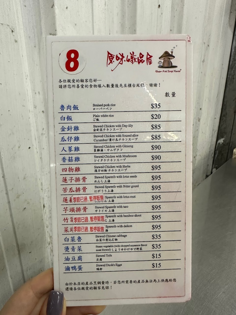 必點湯!! 點了三個湯完全無踩雷 金針雞、四物雞、香菇雞 附近很多家燉品屋一定要認明這家 好吃到就算沒有冷氣也願意再來!! (滷肉飯還好,味道偏淡)