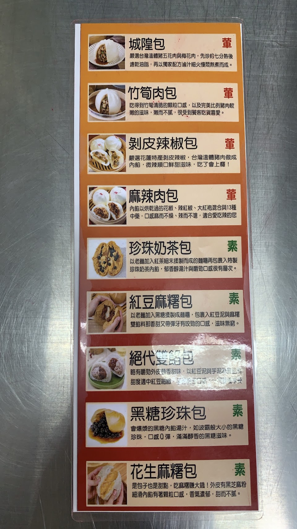 買十送四(有內餡的),梅干包以為有滿滿的梅干菜但是少少的,肉比較多,高麗菜跟筍子沒有特別,但包子蠻大顆的,剝皮辣椒很辣,肉包也不錯,芋頭包真材實料不甜好吃,珍珠奶茶包外皮很好吃,但是流內餡好膩呀。