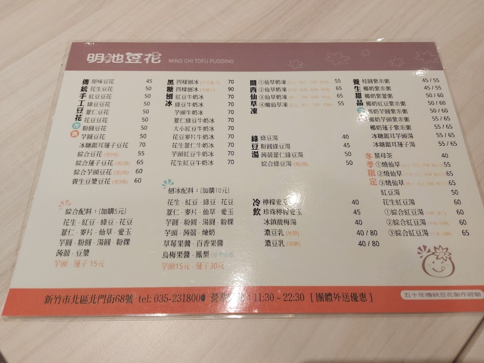 2024最新在地推薦餐廳的菜單_明池豆花 新竹北門店 – 手工豆花 黑糖刨冰 仙草凍 養生甜品 古早味甜點 人氣冰品 推薦必吃 熱門打卡美食 好評 平價銅板美食 下午茶甜品首選 公司團訂 城隍廟附近的菜單、圖片
