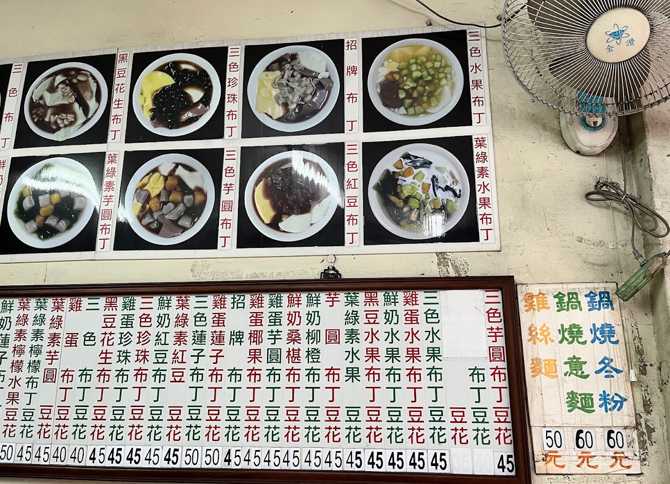 第一次看到這家店是路過,覺得店面招牌老舊但持續有客人上門,覺得應該是還不錯的店。 後來首次到訪吃豆花跟朋友各選了水果和粉圓豆花,在店內吃,有觀察到比較多人會點水果三色豆花跟基本三色豆花。 三色豆花吃起來比較像布丁,分別有巧克力-牛奶-雞蛋布丁的口味感。