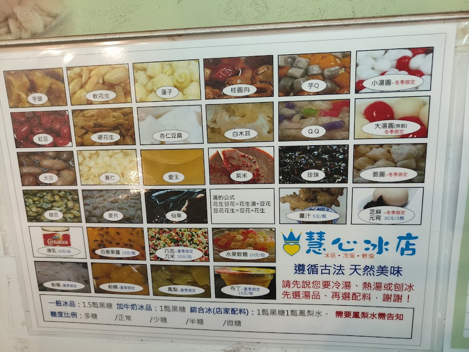 慧心冰店在新竹地區也算是小有名氣的甜品店家,夏天賣冰冬天賣熱的甜品。 位置就在新竹中央市場內,以小攤販來說,商品的種類真的非常豐富與多元。而且還可以依照客人的口味去做搭配,故他們的甜品會有很多的變化。 陸續幾次剛好都是冬天來,三次都是喝花生湯加元宵(芝麻湯圓三顆),總共75元並不便宜,但考量內容物的豐富度是可以接受的。花生湯的口感不錯,元宵也非常好吃,搭配起來真的是絕配。只是前兩次我都是喝熱湯,喝到後來會覺得太甜太膩,今天喝冰的就沒有這樣的感覺。口味較清淡的人要稍微注意一下。 真要說缺點的話,恐怕只能說座位區太少;偶爾會因為太忙忘記客人點的東西。