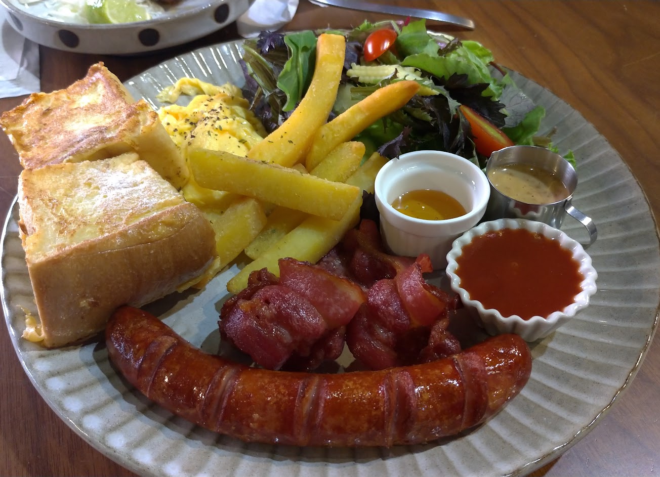 1早午餐的沙拉醬不錯,搭配的蜂蜜也不錯,但主菜雞腿太鹹了….鹹度像鹹豬肉的那種鹹度,要配很多水***2.還點了無骨牛小排動飯,比較起來好吃多了,醬太多如果飯在多一點可能中和一下更好吃,小孩子蠻喜歡的,搭配洋蔥很新鮮。****