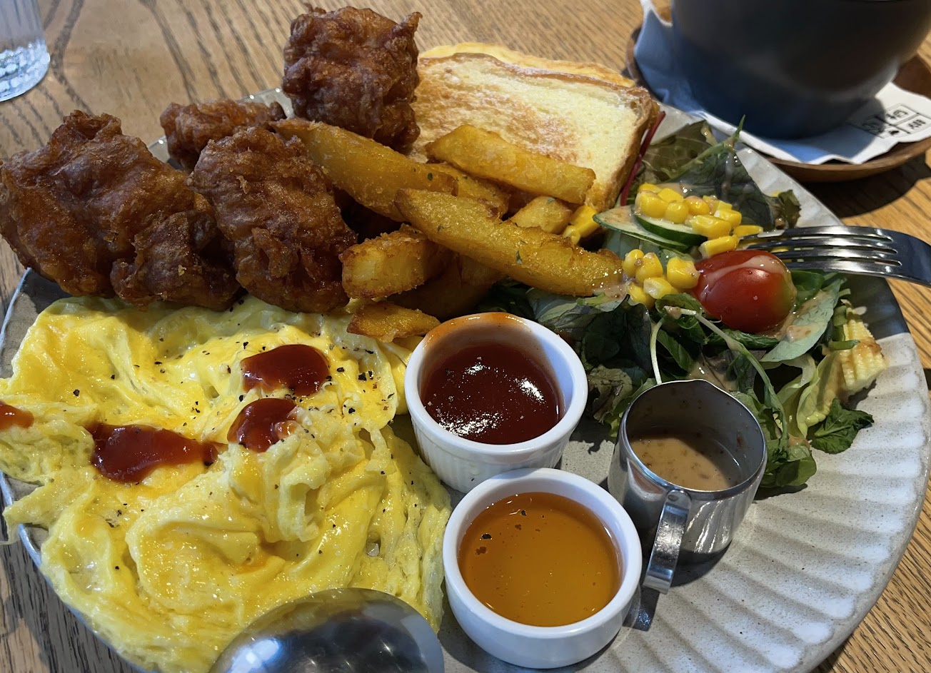 餐點組合看起來很澎湃、賣相很好,價格也算合理。今天點招牌唐揚雞,沙拉食材新鮮,但淋醬有點太鹹;炒蛋很嫩搭配番茄醬很美味;地瓜薯條無論外觀口感都好;法式吐司搭配蜂蜜也是香甜可口;可是⋯⋯唐揚雞不是招牌嗎?卻是我最不滿意的一項,麵衣雖然酥脆,但卻嚴重含油,裏面的雞肉感覺也沒有很入味。小小的失望。