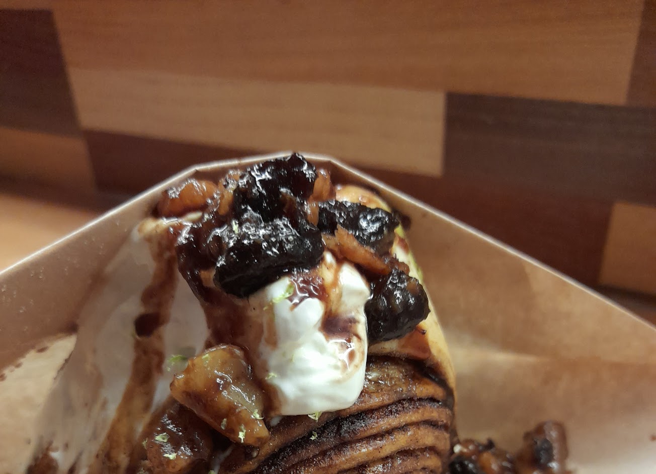 有分外帶及內用限定品項,圖中吃的是黑糖核桃佐白醬,肉桂卷層數很多內夾肉桂味滿濃的很喜歡,整體偏乾式底部吸醬溼潤很特別,卷本身口感偏鬆軟,以漢堡方式手拿吃肉桂卷很新奇,離開前又外帶了一顆太妃糖肉桂卷,相比之下肉桂味較淡但也是不錯(購買時店員有提醒)