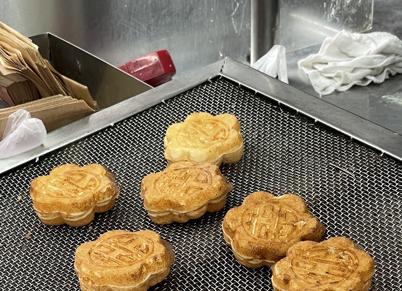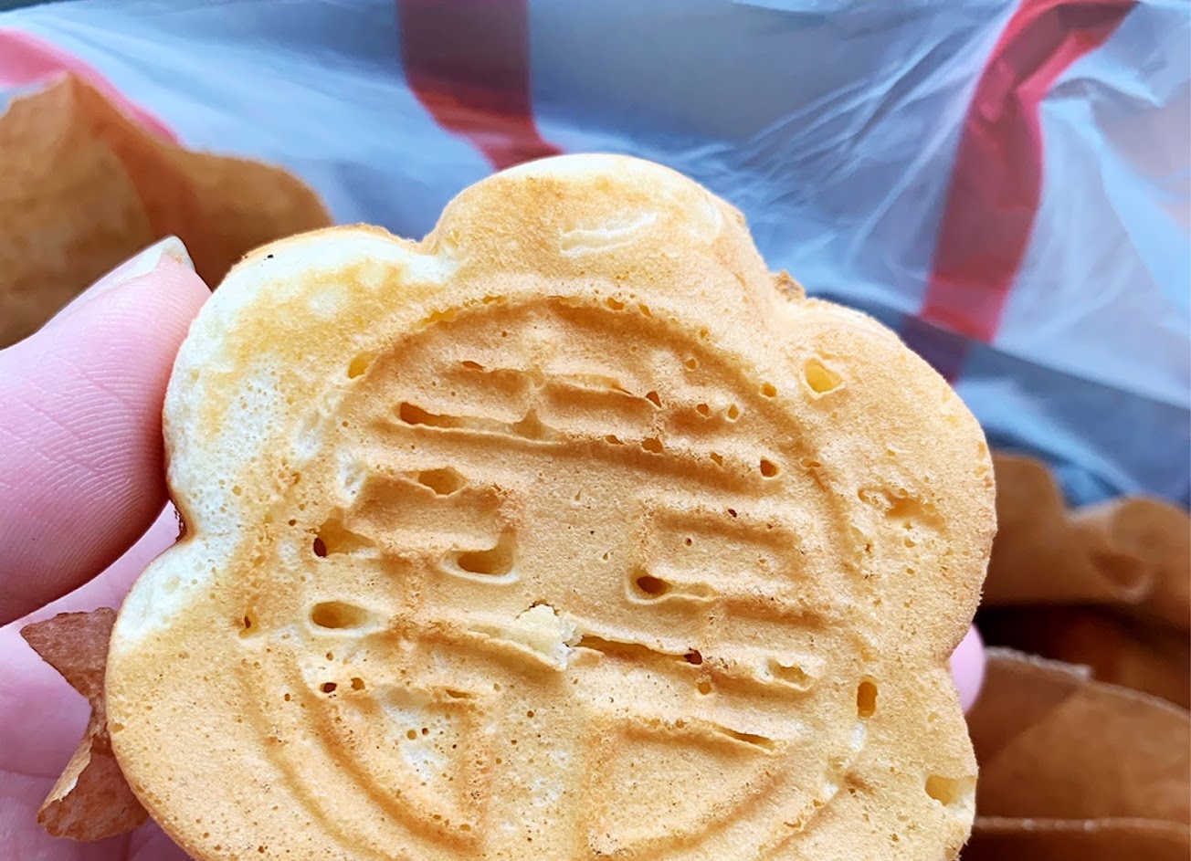 開很久、很多人排隊的雞蛋糕小攤,跟我們一般吃到的雞蛋糕有些許的不同,一般的雞蛋糕皮酥內軟,這家的雞蛋糕是梅花形狀的,剛出爐外皮酥脆,裡面蛋糕體較為Q軟,有些微咬勁,還算不錯吃。