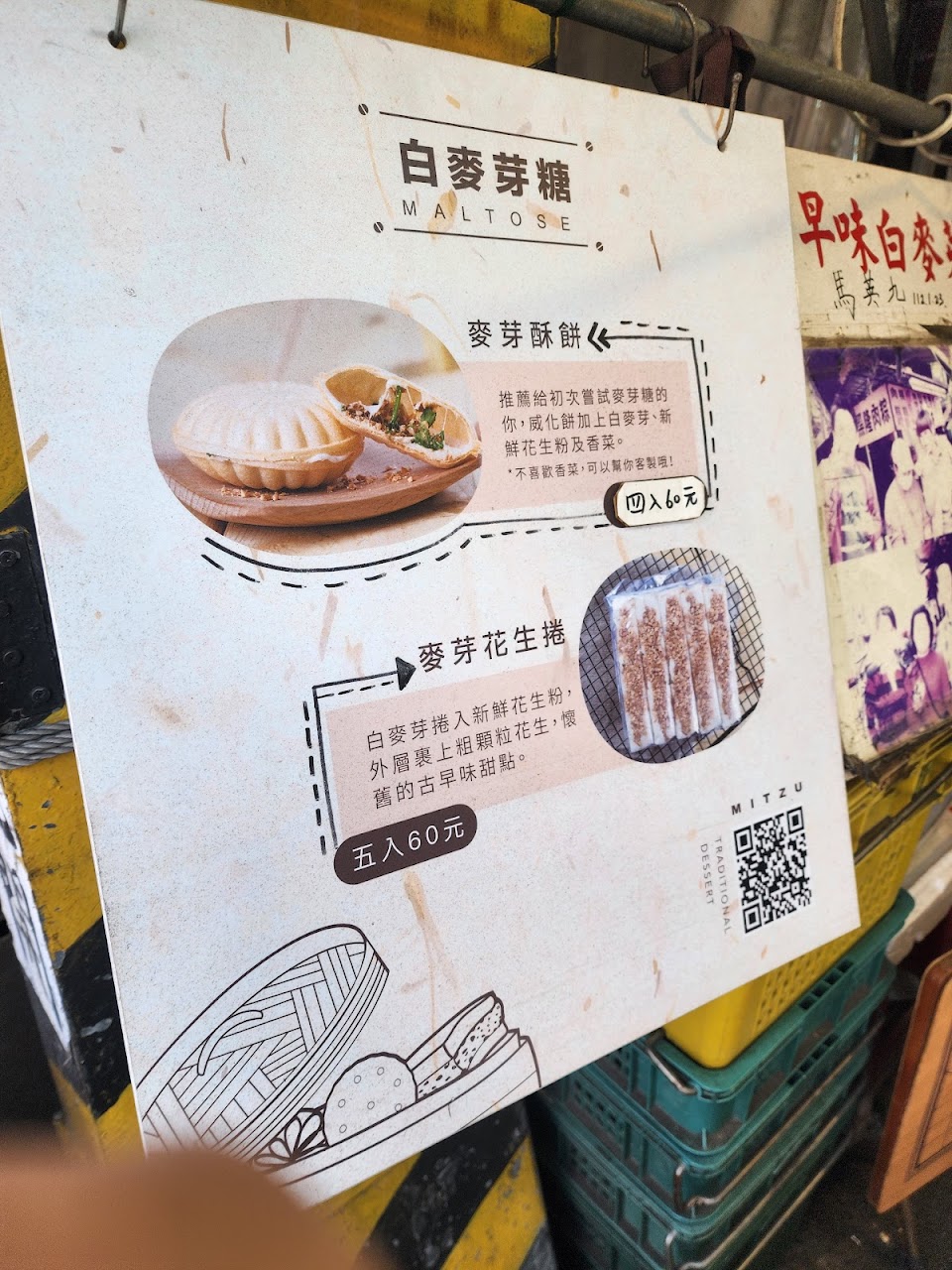 很特別的小點心,四入60元,也可以單買一個15元。單純加白麥芽糖與花生粒粉、香菜,不敢吃香菜可以不加。口味上很涮嘴,麥芽不會黏牙太甜膩,超好吃?? …