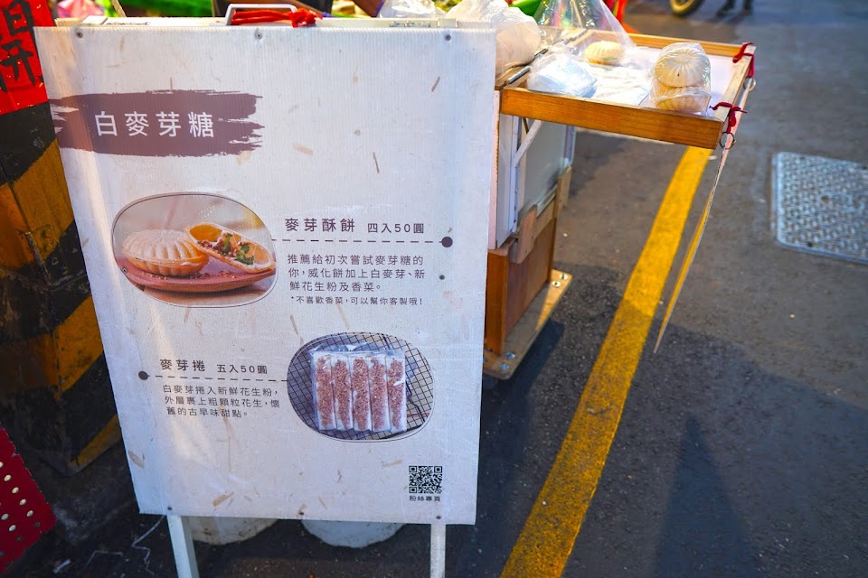 在中山路的城隍廟門口附近的一個小攤,麥芽糖酥餅一個$15,有分包香菜或沒香菜的,四個一袋裝$60,現場製作時,店家都是有帶手套的,若付款需要找零的時候,也不會手套碰觸到銅板零錢。麥芽糖酥餅是很特別的小點心,推薦可以吃吃。