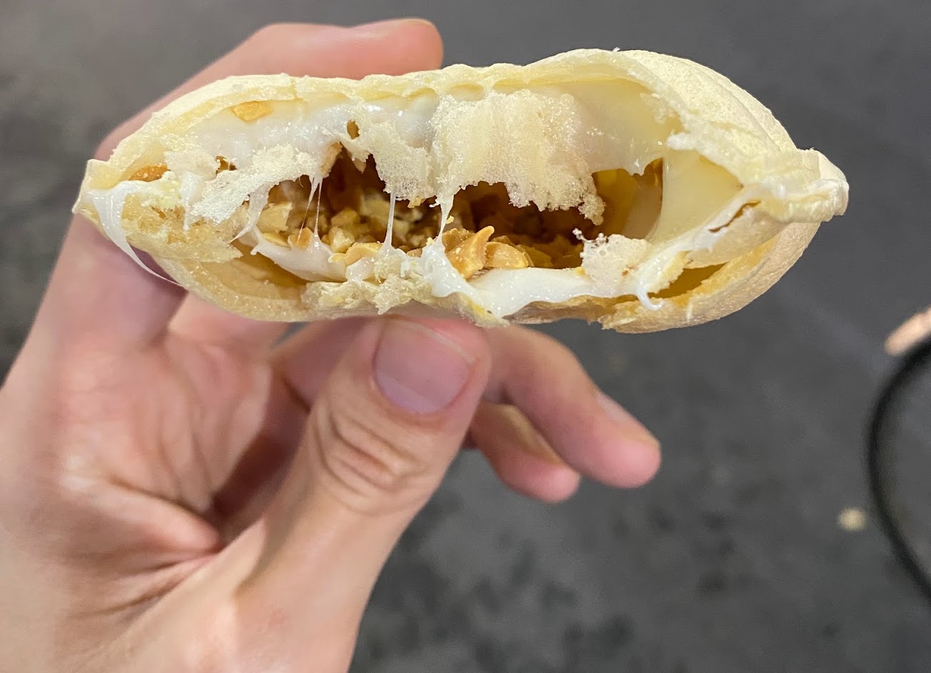 我跟老公一人買一個,我沒有加香菜,吃起來麥芽糖不會太甜,也不會很黏牙,裡面還有包花生粒,不過薄薄的內餡吃起來有一點空虛。但是老公有加香菜,老公就說相較之下真的加了香菜的味道還不錯,不過第一口也是被香菜濃厚的香氣嚇到?? …
