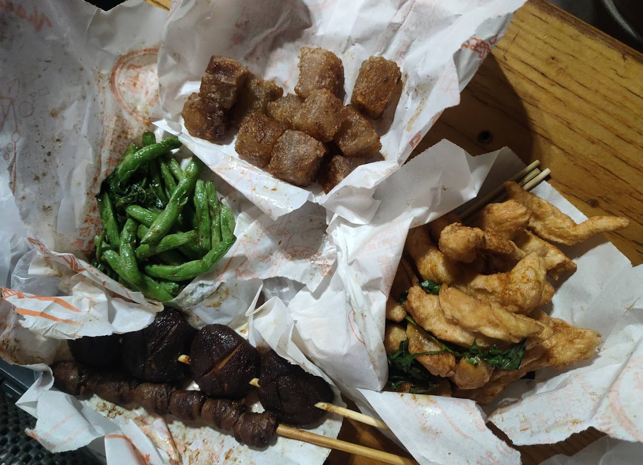 烤雞腿肉串 雞胗 甜不辣 豆乾都不錯 烤豆皮好吃偏貴 雞心NG