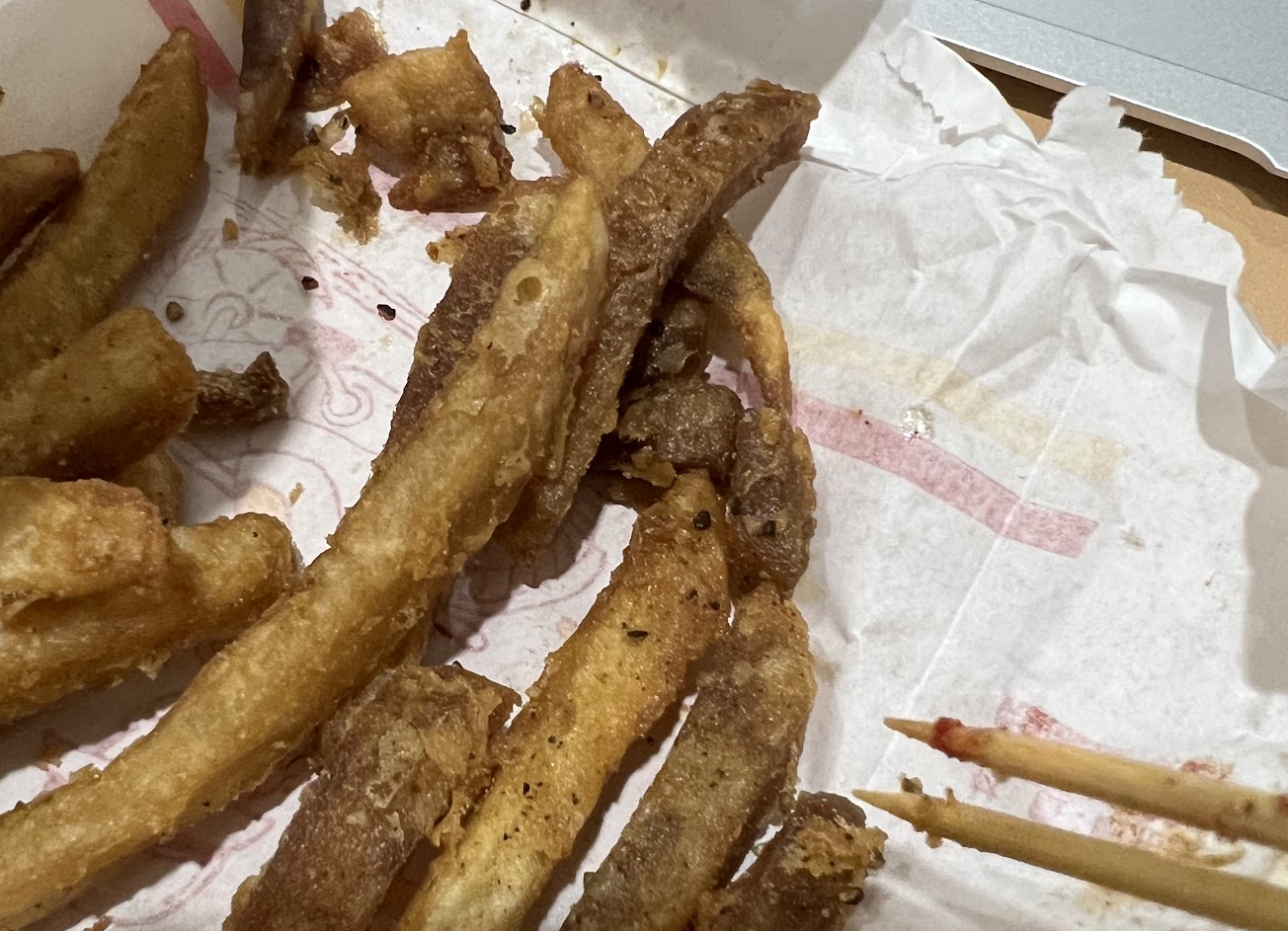 黃金脆薯嚴重吸油,顏色呈現深色,炸出來的東西有點偏深色,不知是油的問題還是炸太久,黃金脆薯吃進去喉嚨會感覺到黏黏的也要噁心