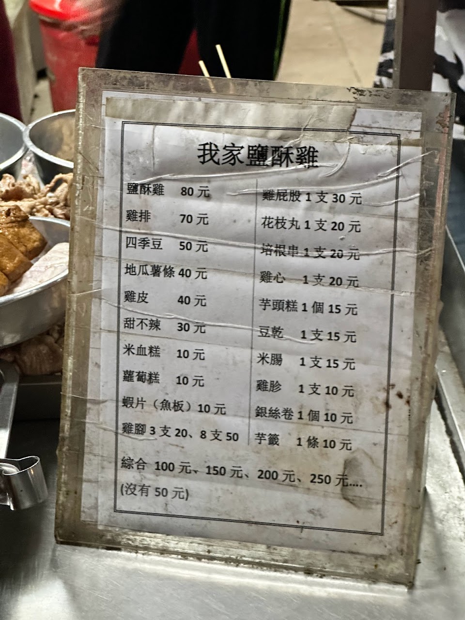 鹹酥雞 古早味 有帶骨的 甜不辣很好吃 豆子醬料甜甜的帶點蒜蓉味 米血糕軟硬適中 地瓜薯條超大塊也很好吃份量超多 肉捲個人覺得普普 豆乾好吃 雞皮是很好吃 但是份量多吃多會膩 芋頭巧 好吃 米腸普通 雞屁股可以 雞排超大一塊 好吃 重點是份量 買一次可以吃個二三天 第二天用氣炸鍋在炸過就像現炸的一樣!