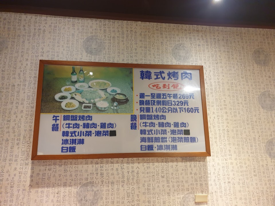 晚上趁著中秋前去用餐,好險有預約,當晚幾乎爆桌。一進門老闆態度親切,很遵守防疫程序,介紹菜色簡潔有力清晰明瞭。上菜速度是可以接受的,晚餐菜色:(前置兩盤小菜、銅板烤肉「牛肉、雞肉、豬肉、辣豬肉)、蒸蛋、韓式拌飯、韓式煎餅、豆芽菜湯。這些無限吃到飽。疫情關係,沒有提供茶水、冰淇淋服務,喝的得單點瓶裝飲料(綠茶、檸檬紅茶、真露酒、瑪格利酒、啤酒)。總結:真的不錯吃~服務人員,親切、耐心、有效率。cp值高~~