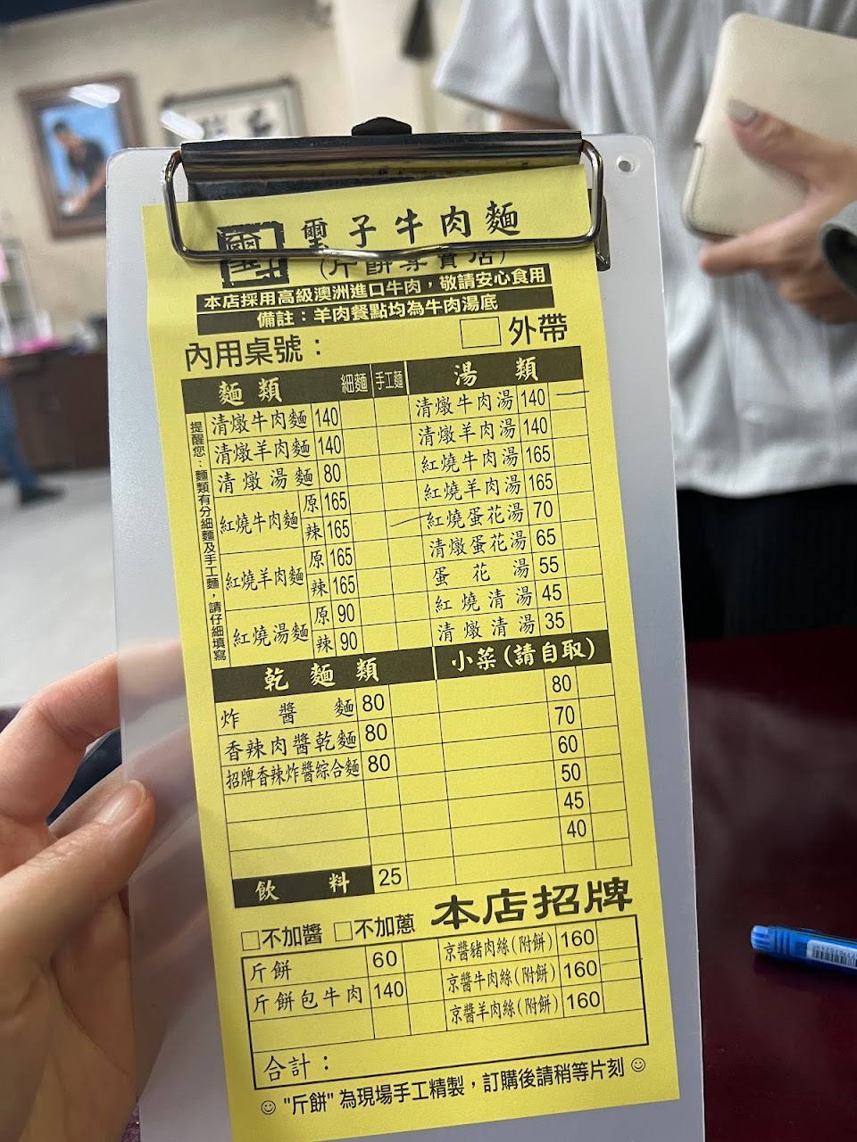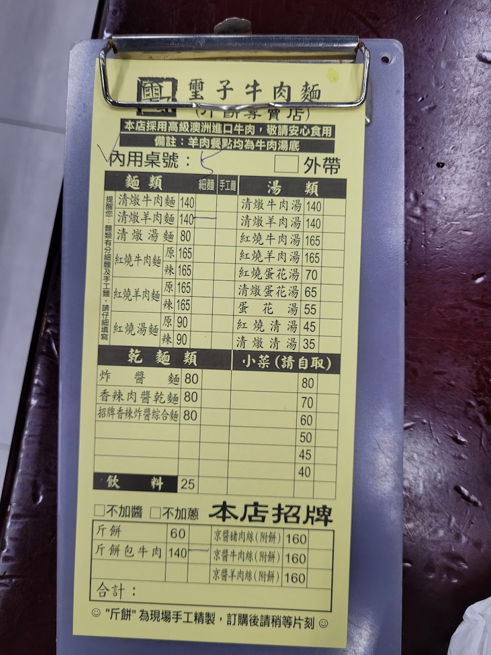 斤餅還可以,清燉牛肉麵不夠味、紅燒牛肉麵都是醬味,麵心沒熟,小菜份量少,價格偏高