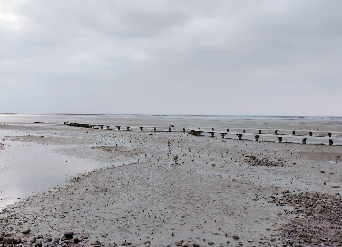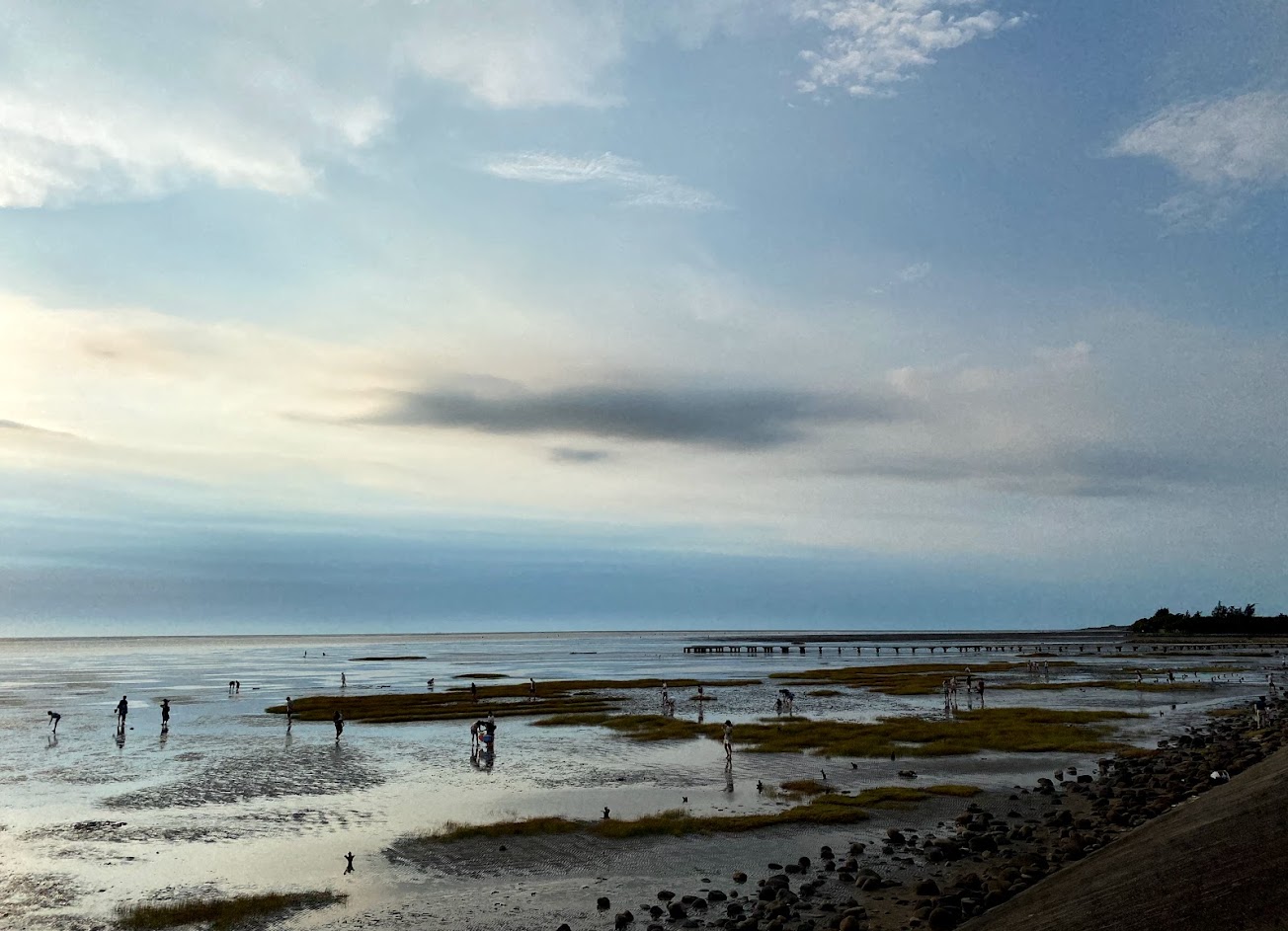 夕陽美潮間帶物種豐富,濕地屬泥質因附近有養殖牡蠣,泥巴中牡蠣殼很多,容易割到或刺到腳,入口處有沖洗水龍頭及廁所。