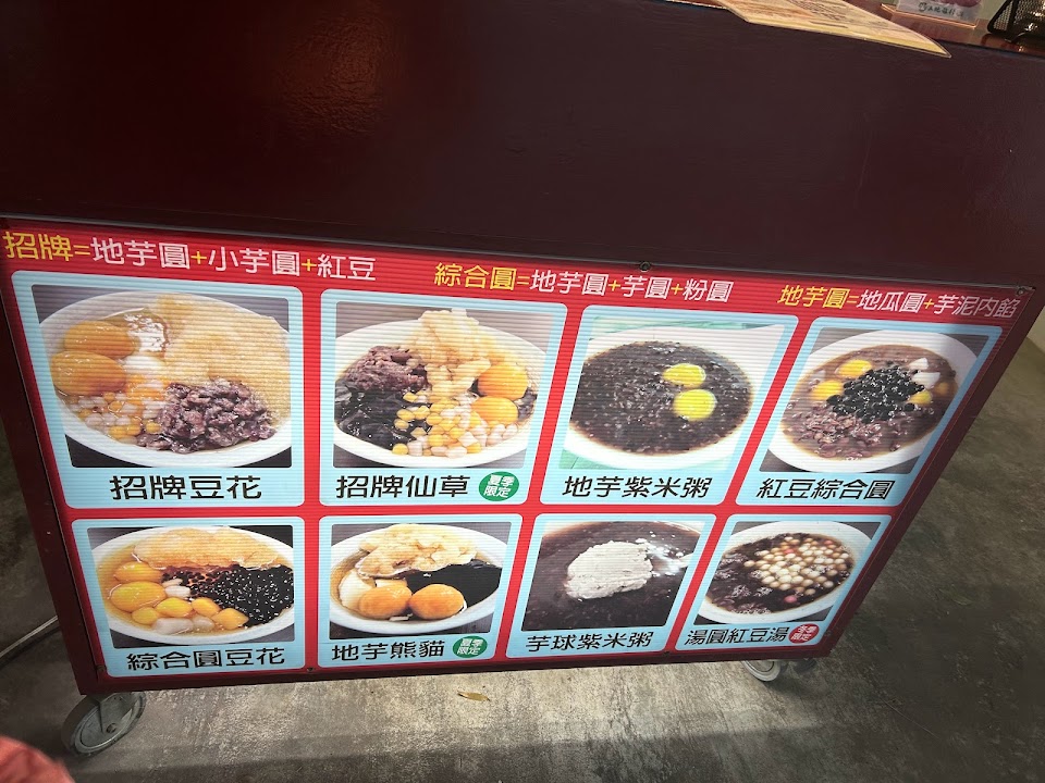 在大庄住很多年了,一直想吃,但是時間搭不上。剛好今天經過有開,店面在一個小巷裡面,沒有明顯招牌,容易忽視而過,開汽車是無法停車的,要從大庄路或中華路走進去。目前價格有調整貴五塊錢,地芋系列一碗50元。豆花仙草口味一般。特色在於地瓜圓裡面有包地瓜泥,味道是比較特殊的,建議現吃,這種食材不建議冰過,口感會變硬。