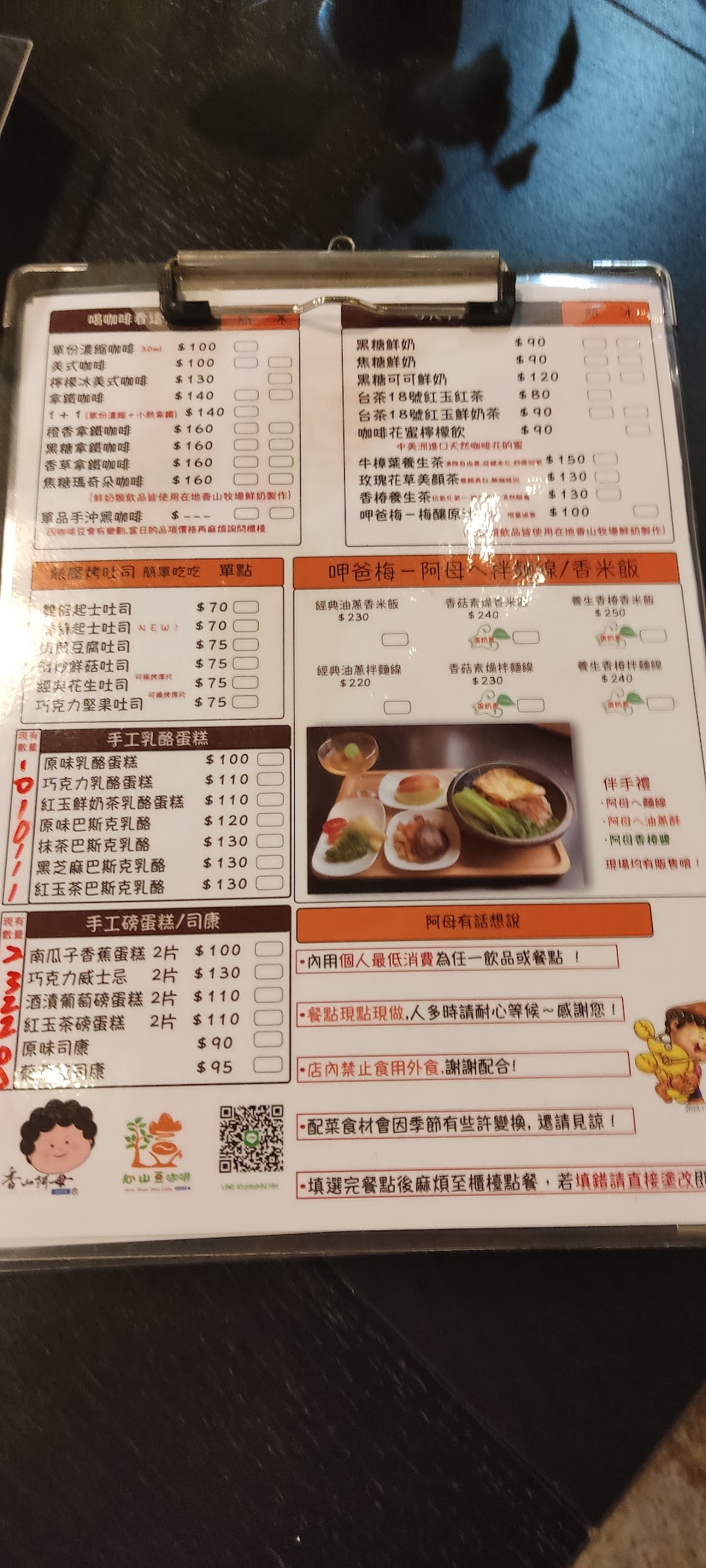 ?巧克力堅果吐司75$ ?香菇素燥拌麵線200$ ?紅玉茶磅蛋糕110$ ?台茶18號紅玉鮮奶茶85$ ?黑糖拿鐵咖啡120$ ?香草拿鐵咖啡120$