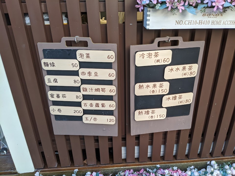 今天與孩子臨時討論過去的,因為我們不是太餓,因此在悠閒的庭院慢慢吃著麵線與豆腐等現烤烤雞,擂茶與水果茶也不錯,值得再訪喔