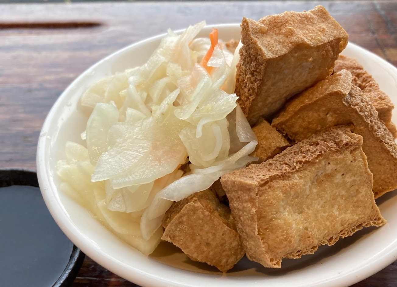 白玉豆腐:鹹,裡頭是類似日式揚出豆腐白嫩的,有別於平常吃臭豆腐的酥脆口感,豆腐、醬油及醃蘿蔔互相搭配得很適合