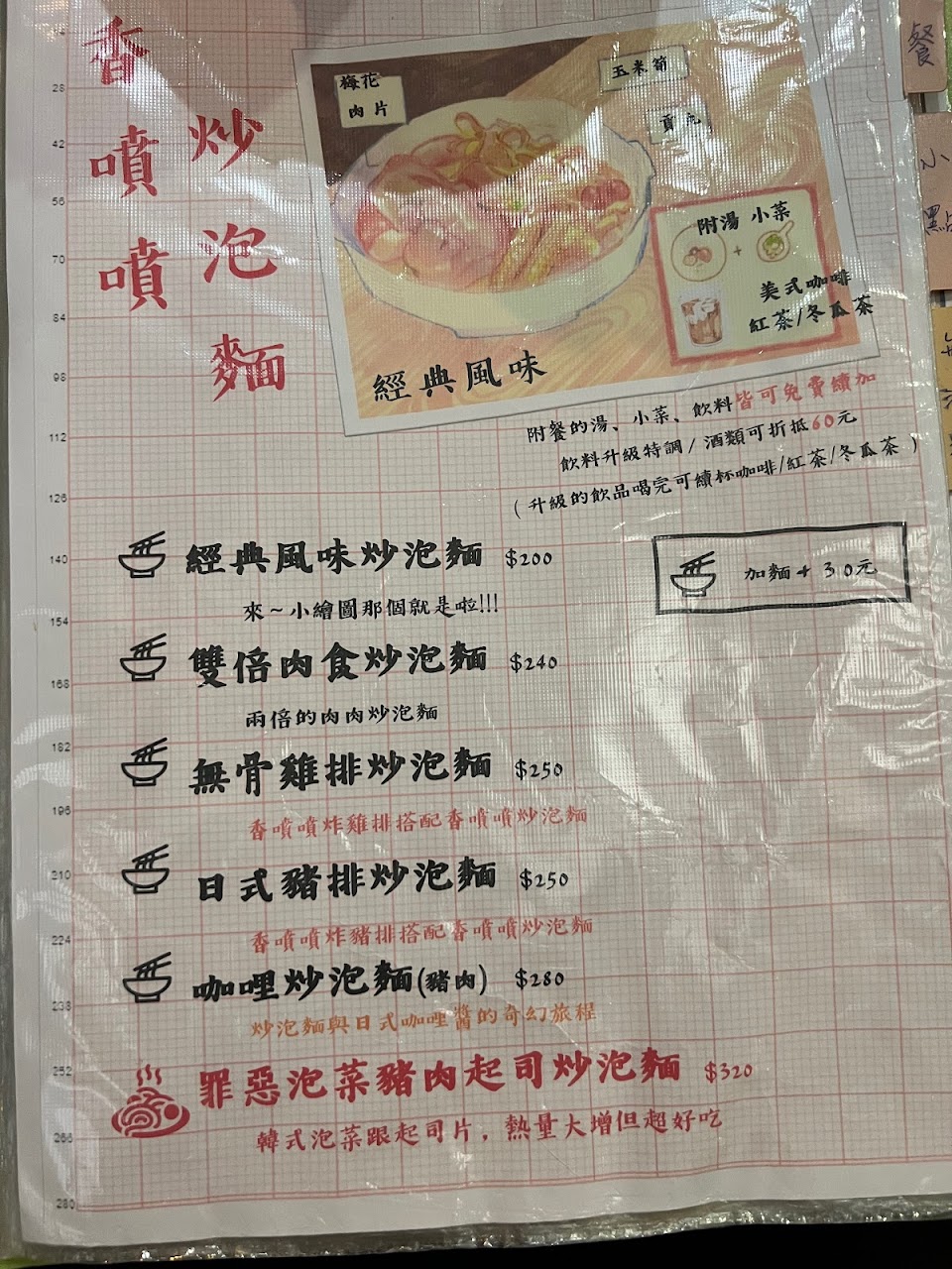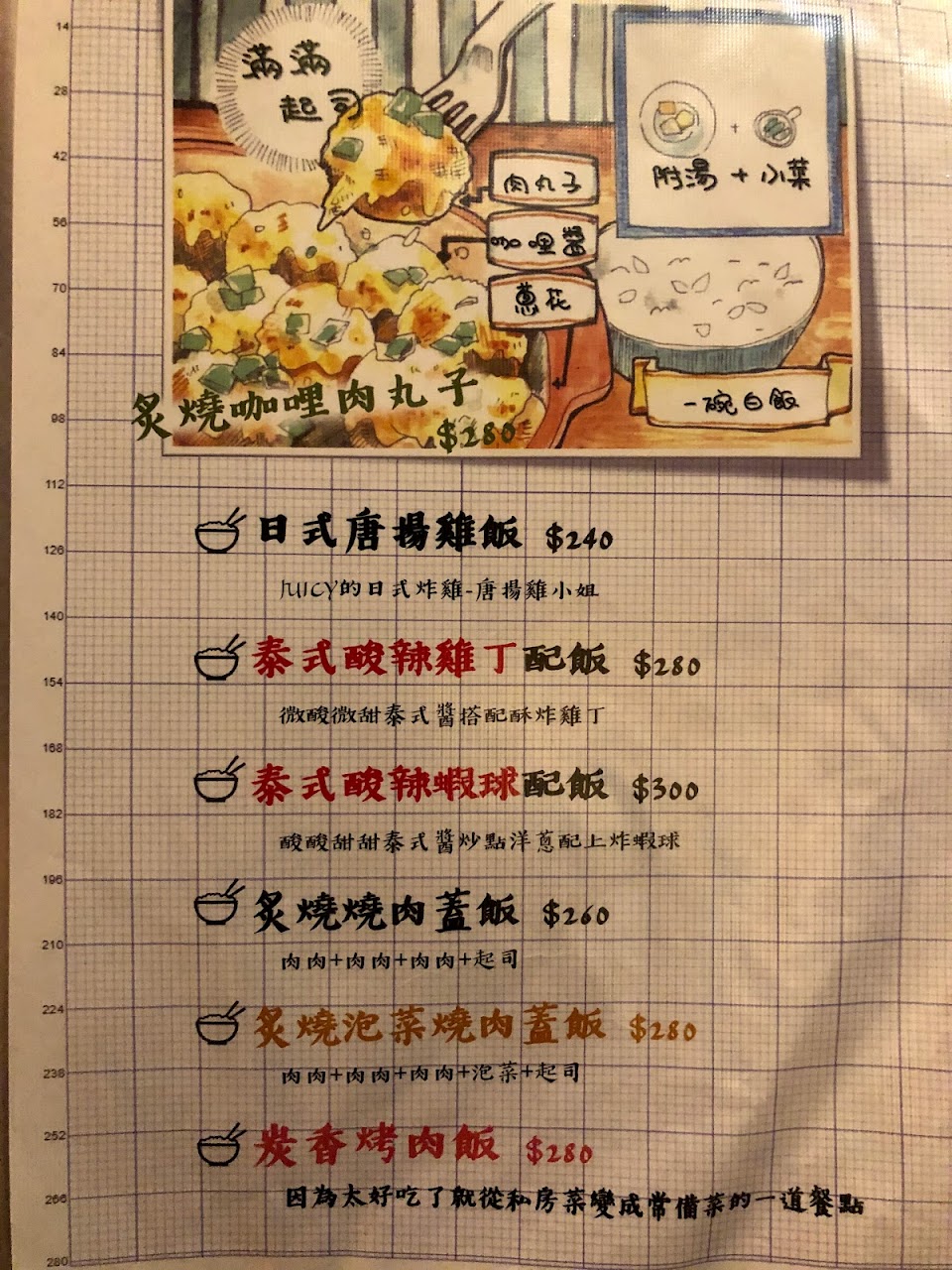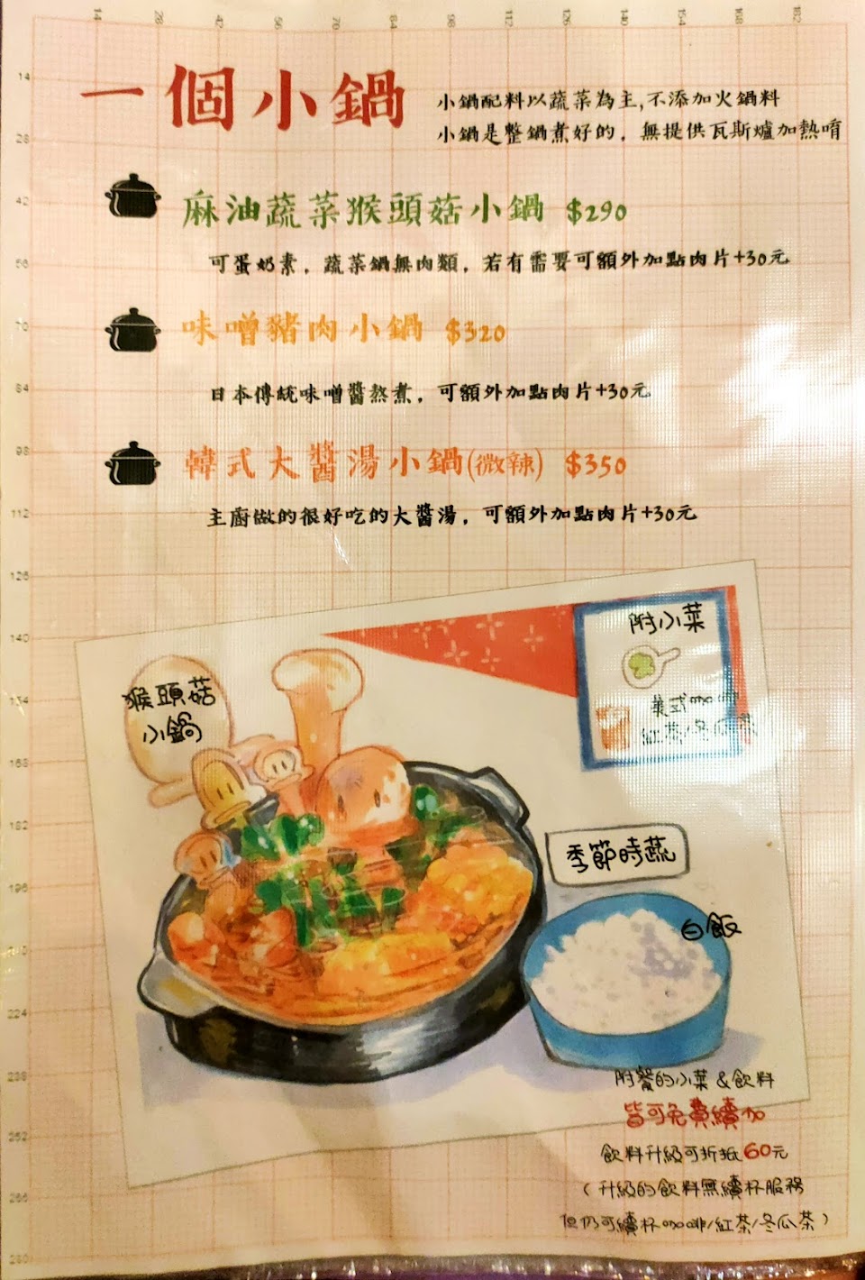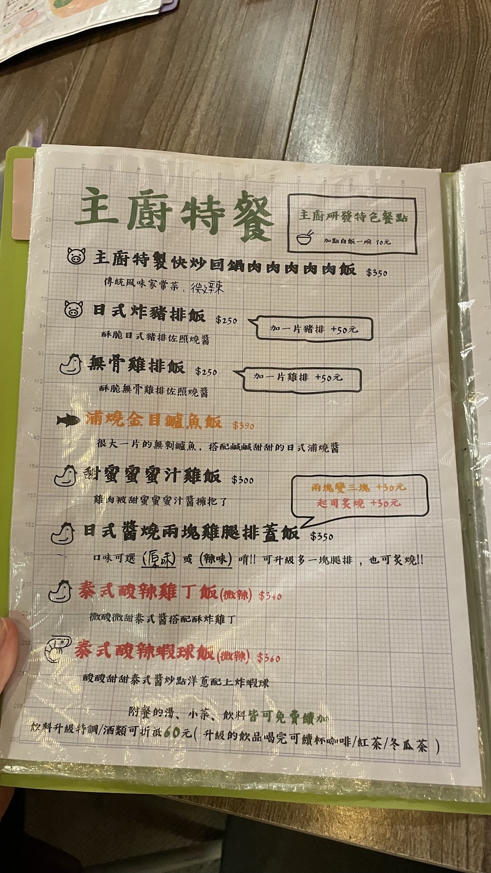 所有主餐都附小菜、湯,飲料,全能免費續(飲料換單品的話除外)