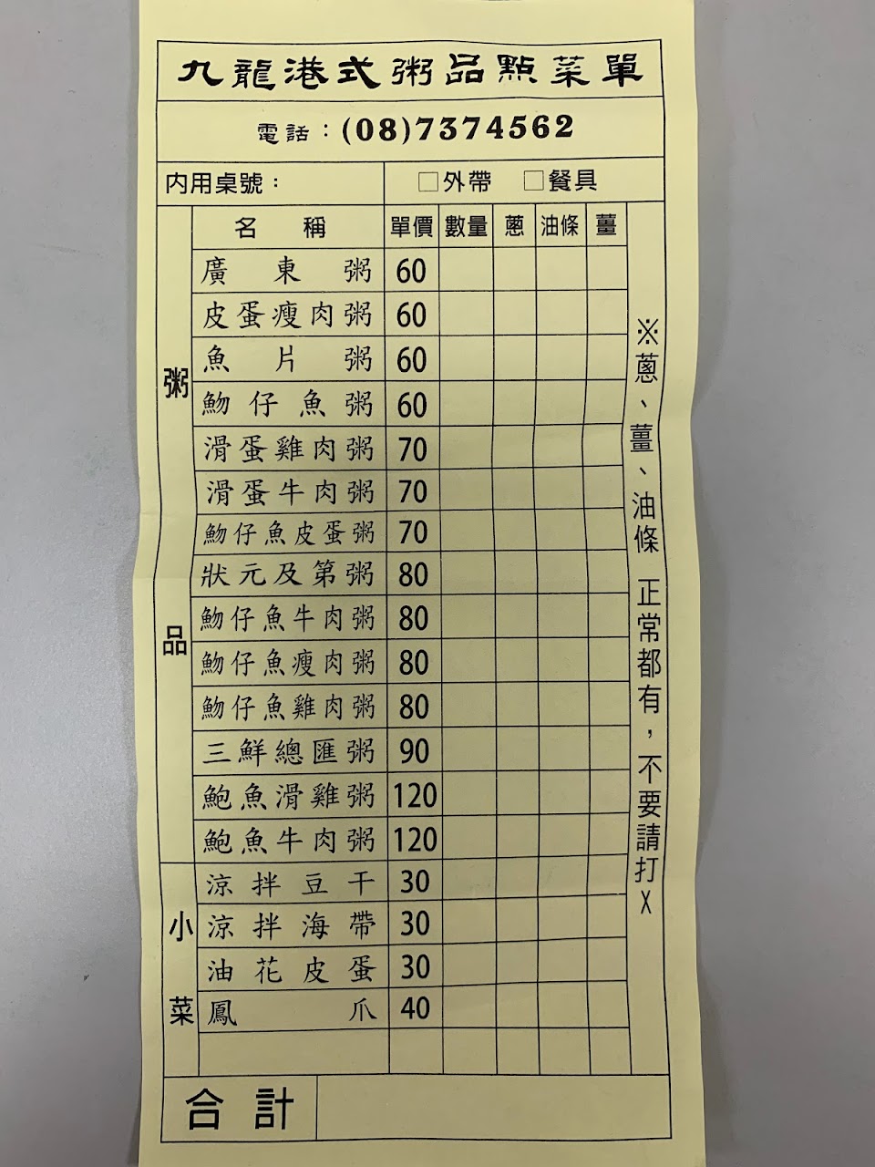 老闆娘態度很不耐煩,沒注意到菜單上還有「☐餐具」,因我不用餐具跟塑膠袋,老闆娘叫號後我告知不用那兩樣,他老大娘一臉不爽說怎麼沒畫菜單上的餐具,解釋沒注意到之後,他繼續碎念塑膠袋不要也不早講(您叫號的時候就裝好了ㄟ……),旁邊員工大笑說「最後是不是粥也不要了哈哈哈」,我真的笑不出來,沒人願意造成別人困擾,老闆娘以為我是故意的嗎==