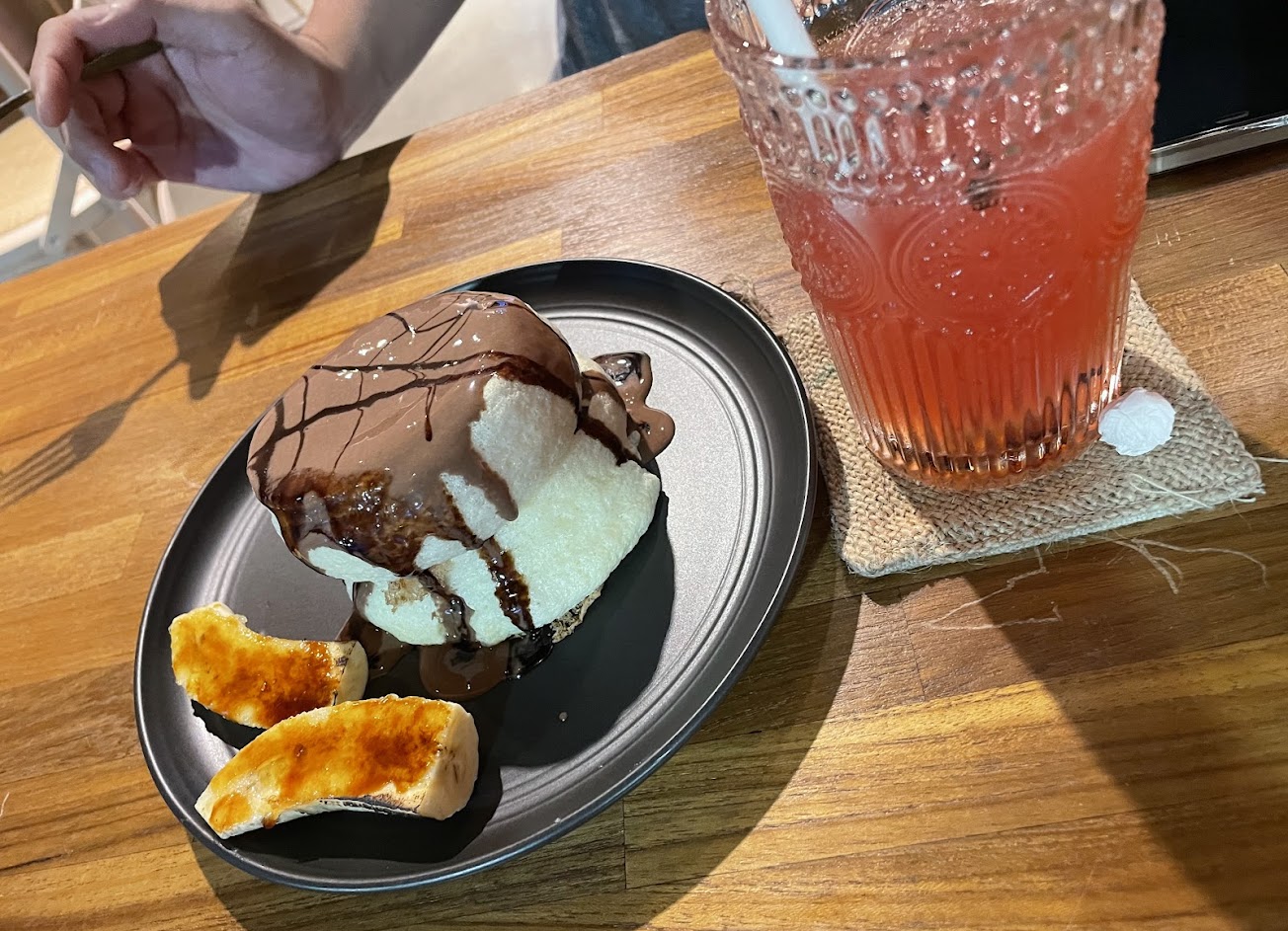 環境優美,氣氛不錯,蠻推水果千層蛋糕 ▪️水果千層蛋糕使用草莓、奇異果、葡萄、香蕉、哈密瓜以及鮮奶油,整體味道與鮮奶油搭配的剛剛好,十分好吃。 ▪️接骨木蔓越莓氣泡飲在炎熱的夏天配上一杯酸酸甜甜冰涼的氣泡飲剛剛好。 ▪️焦糖香蕉巧克力舒芙蕾對我來說有點踩雷,舒芙蕾本體沒什麼問題,但是上面的巧克力醬竟然是鹹的!味道像是鹹的阿華甜,整個吃起來蠻怪的;焦糖香蕉放在旁邊做搭配,是好吃的呦!