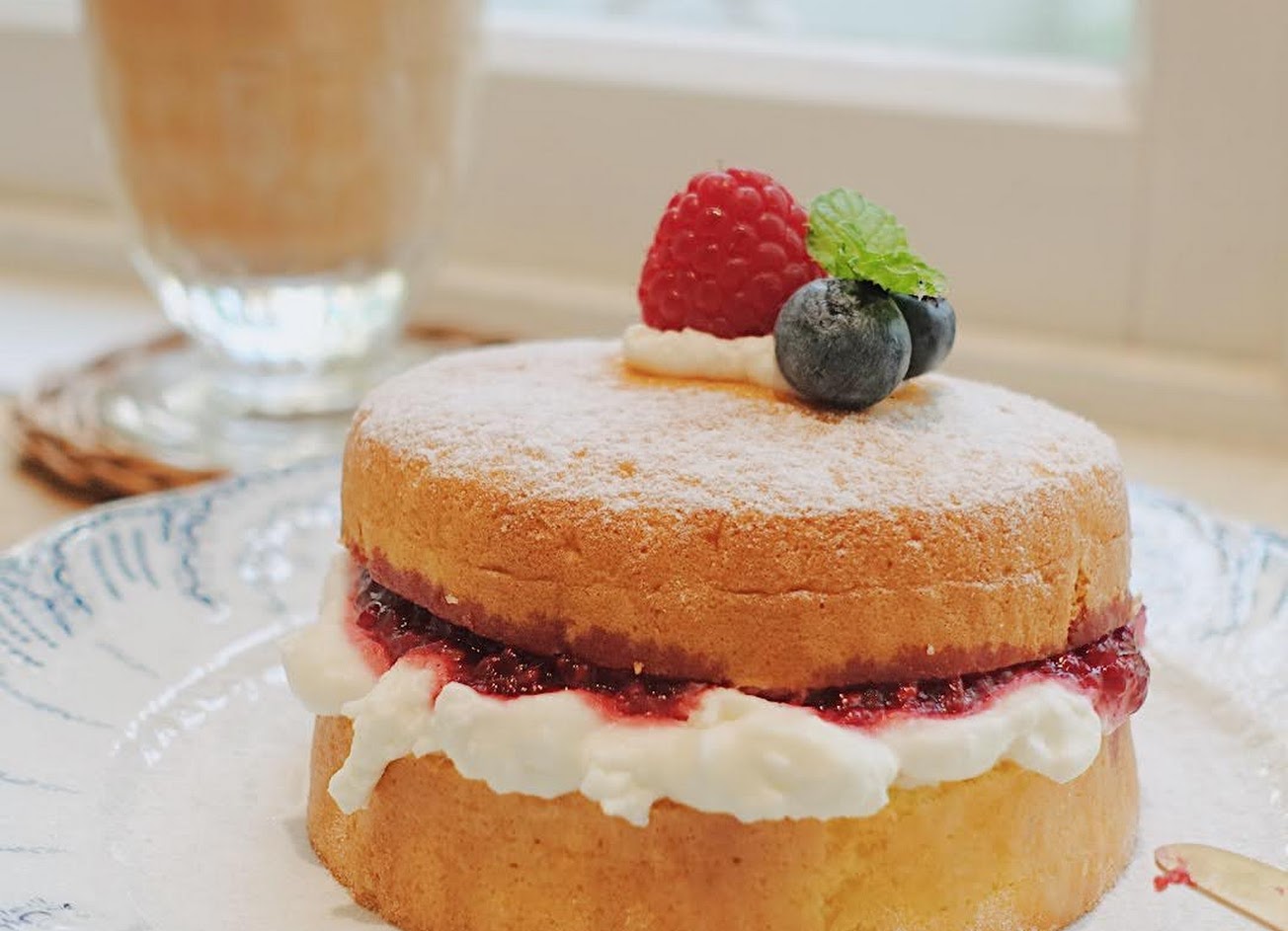中間夾著酸甜的覆盆子果醬及滑順鮮奶油,蛋糕屬於紮實的口感,充滿蛋香及奶香,有點類似厚鬆餅,口味不錯,只是我吃不太習慣
