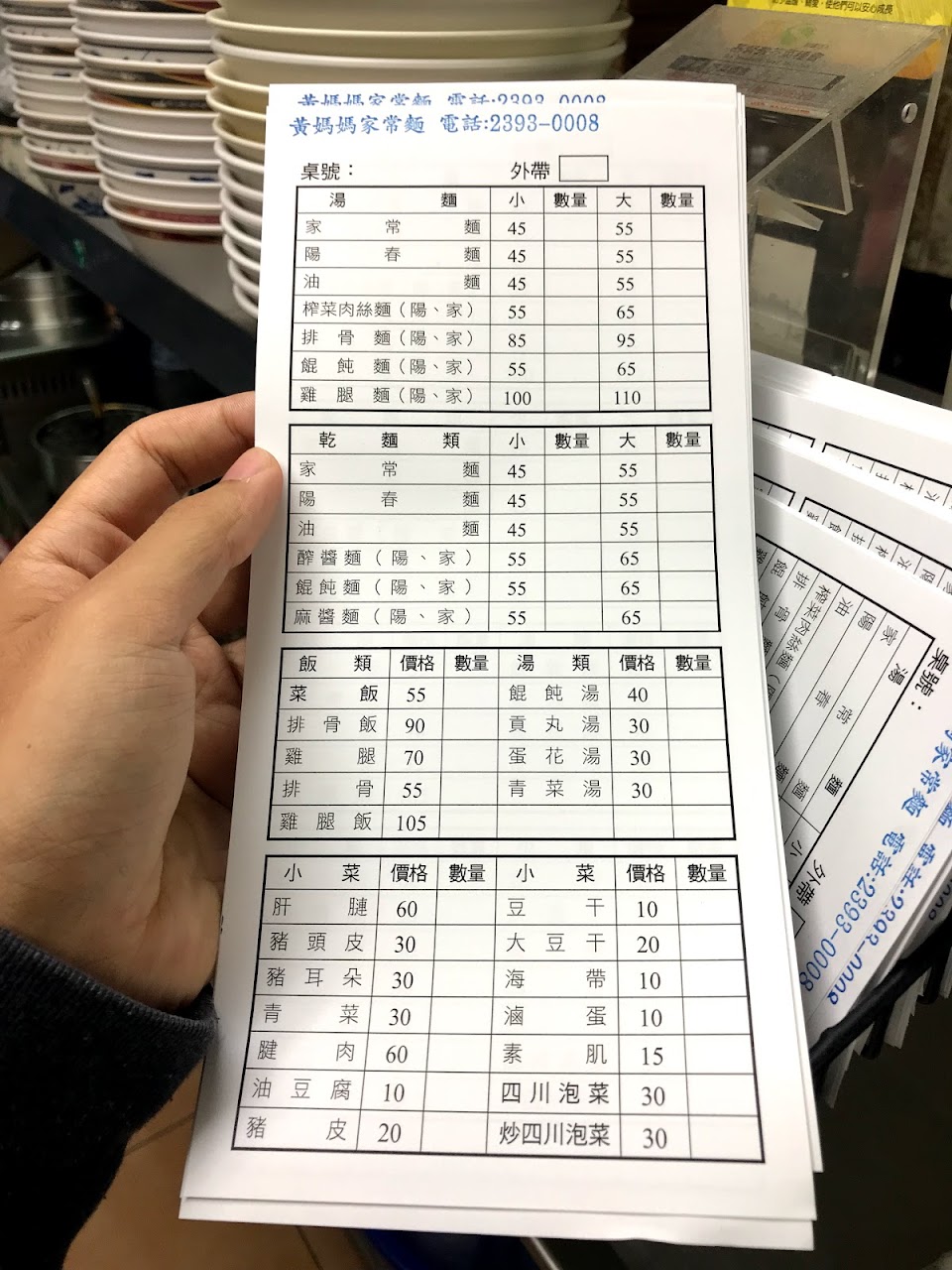 店家賣的算是家常菜,從菜單來看,不外乎麵、飯、滷味、湯、燙青菜。內用前要先拿菜單+筆畫單後交給店家,可以不用先付款。