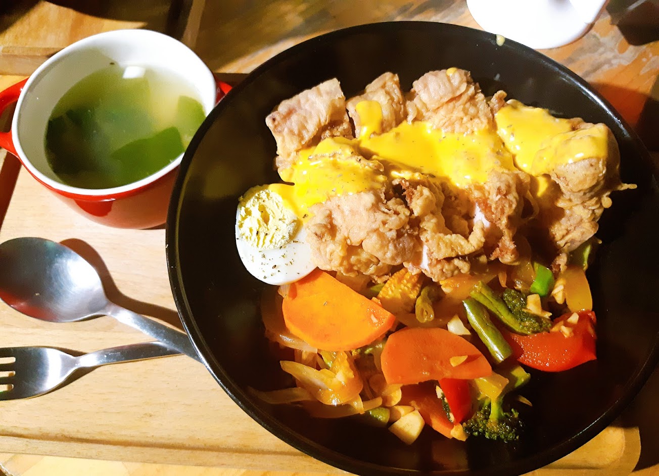 彩椒甜豆蘑菇醬+荷包蛋+牛肉丸口味佳,配海菜湯就有點嘍,單價150元算是平價。開放空間飛蚊太多無法久坐是弱點。