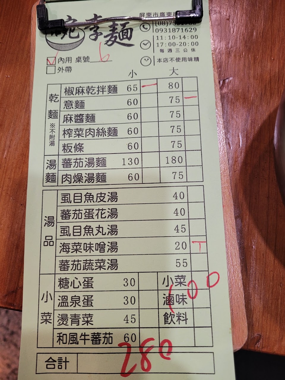 這間就位在屏東市的廣東南路上,一到中午放飯時間,附近的上班族還有客人就會擠滿這裡,店裡環境蠻舒適的,會時不時聞到一點點的檜香味,只不過位置的數量並不多,想要來吃的要提前來搶位,這次我點的是『椒麻乾拌麵』,椒麻的味道非常的香,麵體的部分也是我喜歡的,吃起來麻大於辣,但都是我能接受的範圍(因為我很怕辣,我是貓舌頭哈哈哈哈),老闆還會在麵裡放一些舒肥過的雞肉跟些許的蔥花,雞肉吃起來蠻嫩的不會柴的那種,最後我還有點一碗他們的『番茄蛋花湯』,喝起來的味道很夠,最怕那種喝起來很清淡完全沒味道的,但這個完全不會,整體來說這間的價格便宜、環境舒適、料多實在、CP值算高的店,難怪每次一到營業的時間都會這麼多人?