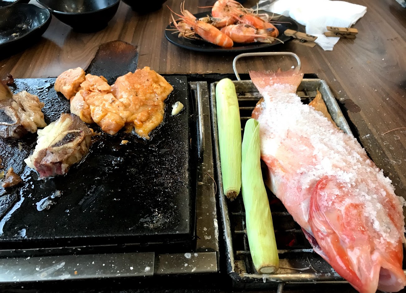 老闆和員工態度都很好,也沒在怕你吃,值得推薦!但蝦子被我活生生塞進鐵網裡,魚在我還能感受它肉在抖動的狀態被我塗滿鹽放上烤網,自己覺得自己有點殘忍⋯⋯(但大概可以證明真的很新鮮)