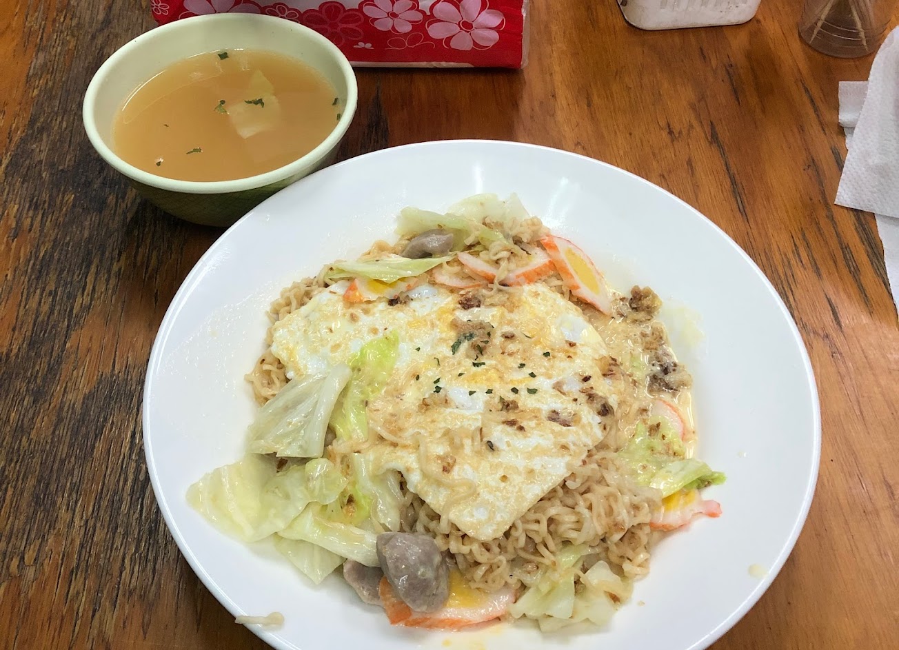 炒泡麵看起來是一位年輕店員負責掌廚,看他手沒停過就知道生意有多好,以及很多客人都選擇炒泡麵。炒泡麵風味十足、麵條也不會過軟過硬,但如果吃泡麵會選擇減少調味料的朋友,這一份的口味可能對您來說會有一點太過。另外加上燒肉片覺的普通,下次再來吃會選擇單純炒泡麵。