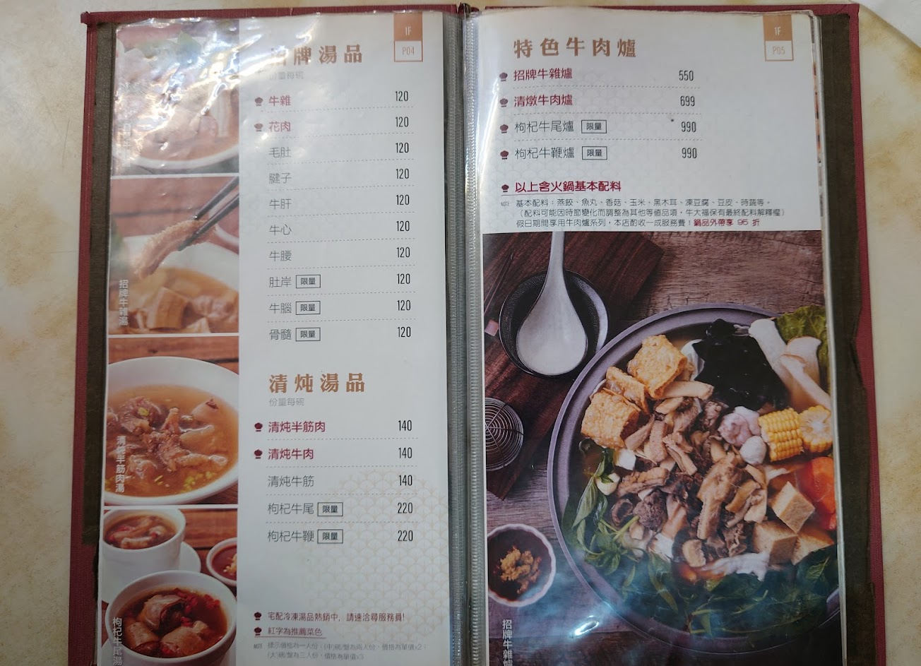 餐點部份中下,cp值低口味普通,點了香炒牛肉、尖筍牛肉、花肉湯、清燉牛肉湯和牛肉燴飯,熱炒牛肉感覺普通,小盤就算了肉也很少沒幾片,牛肉燴飯肉也很少還放了一堆三色豆充數,招牌花肉湯還行,但也沒有好喝到很驚艷,清燉牛肉湯有味精感,肉沒燉嫩而且只有6塊,這樣還要$140真的不行。