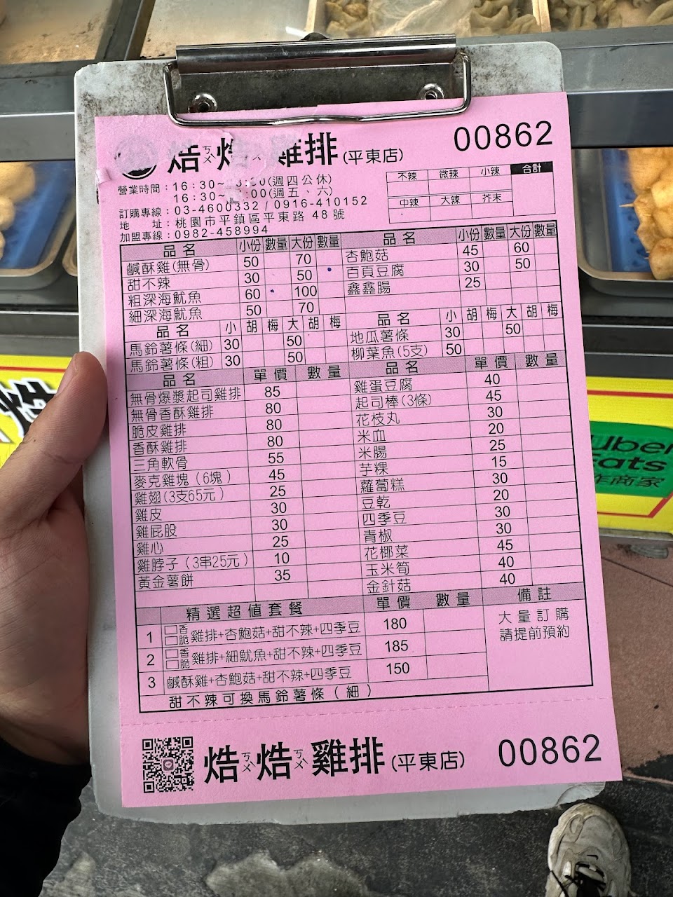 叫了3份雞排、1份杏鮑菇,真的不錯吃!