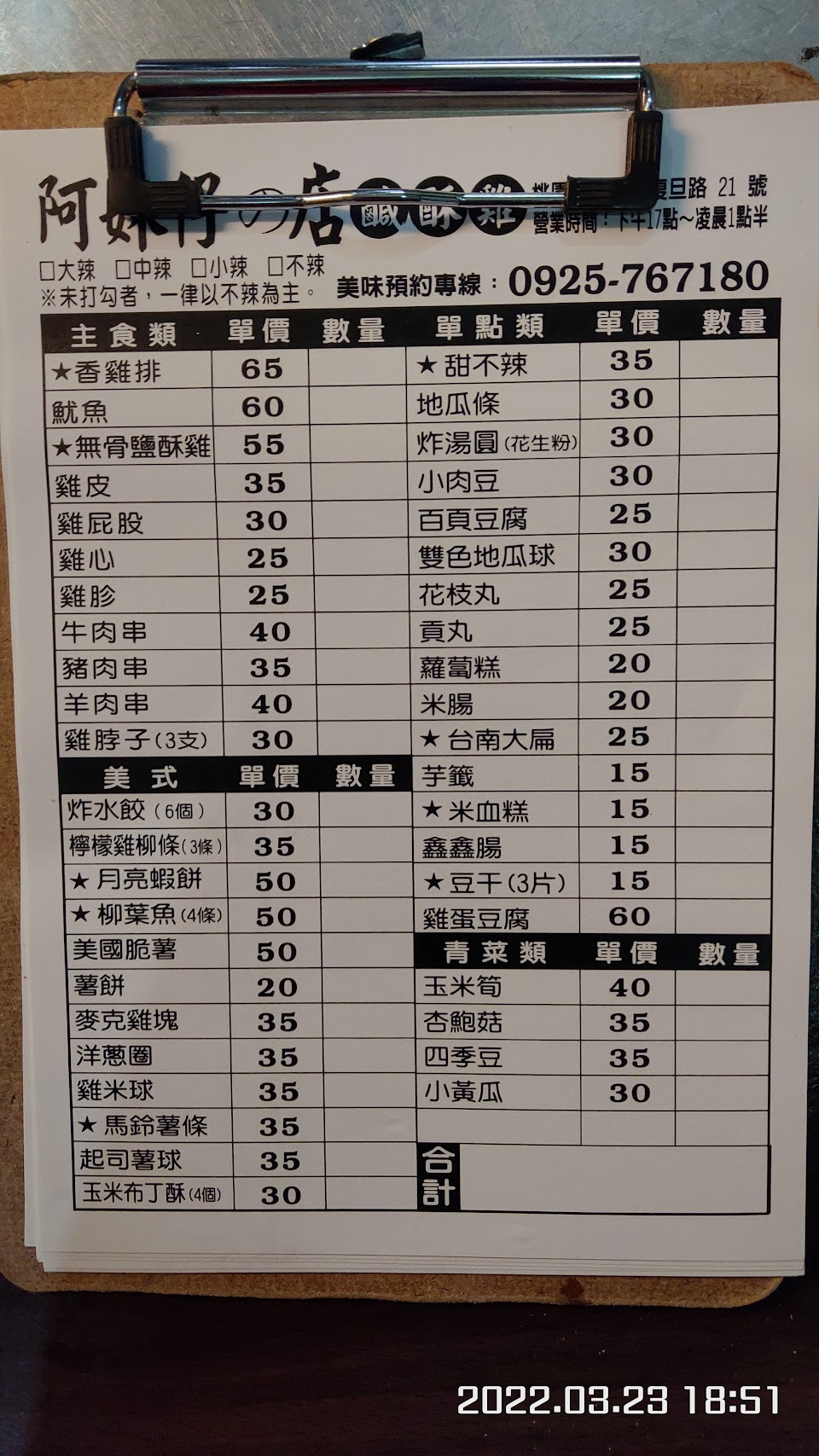 餐點:雞排70、鹹酥雞60、甜不辣35、雞心30、地瓜薯條、百頁豆腐、米腸、豆乾。
