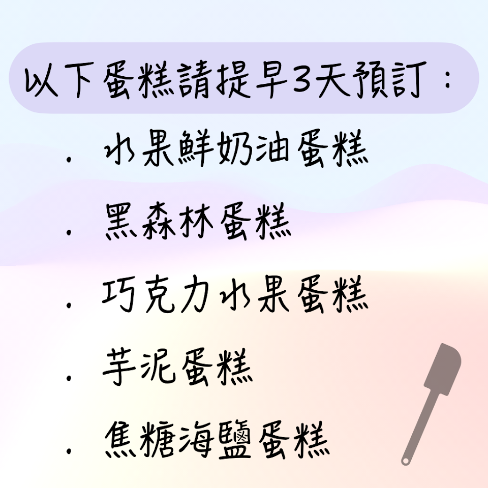 六吋水果芋泥蛋糕,水果品質佳,長輩喜歡蛋糕主體不會太甜,沒有過多鮮奶油是優點。連假期間願意臨時接單,工作室還能取貨這點大加分~未來有機會回購。
