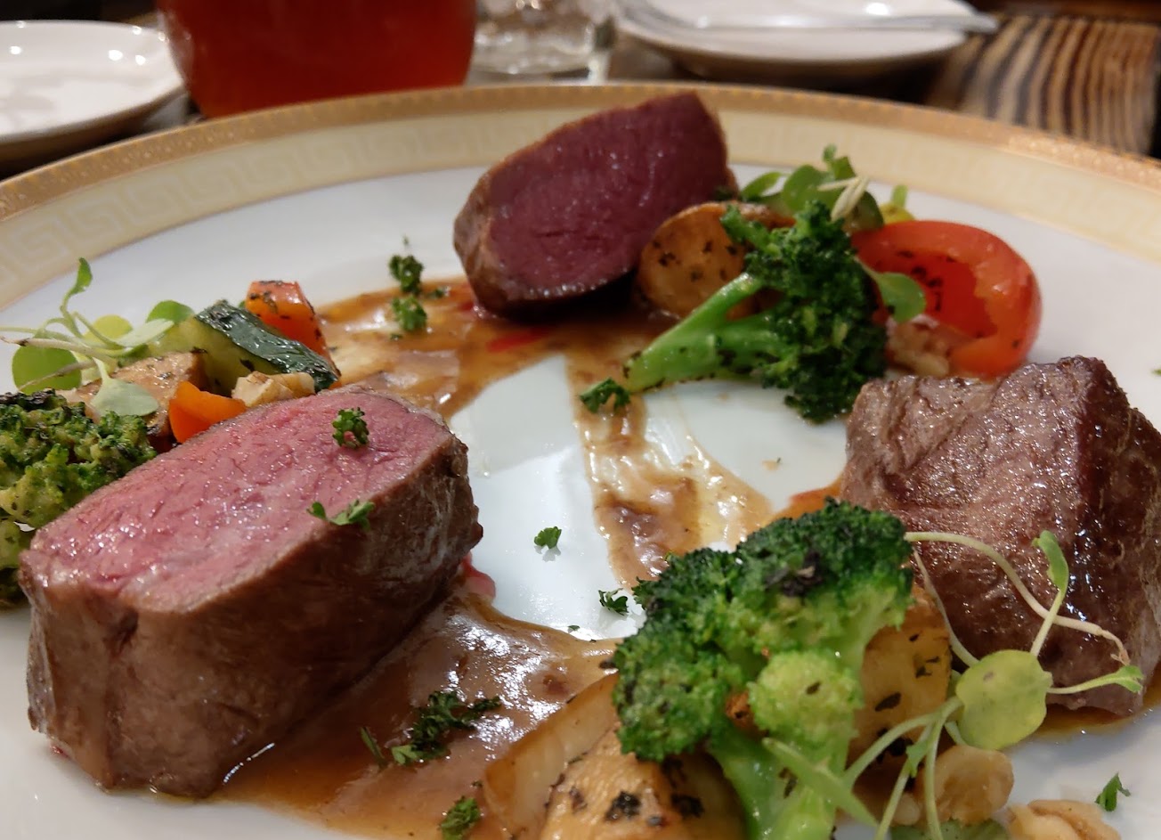 今天點的主菜是肋眼牛跟里肌豬肉質口感還可以,搭配香氣好喝的紅白酒。