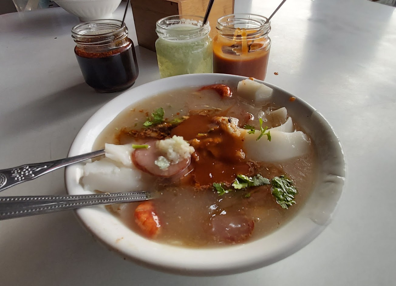 白色部分有點像加大、加厚的板條,每一家的配料各自不同,有的會有臘腸、有的會有豬肉片,醬料也是獨門配方口味。