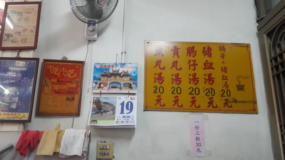 肉丸的皮,是自家現用新鮮馬鈴薯,磨成粉製作的,Q彈好吃,有點像水晶餃,內陷有蝦,肉,筍,一份三小粒,是30元。也有現切粉腸,香腸,大腸,有分大小份,小份30。還有各類湯品都20元,今天點了豬血腸子湯,和貢丸湯,很新鮮,只是湯有點鹹。