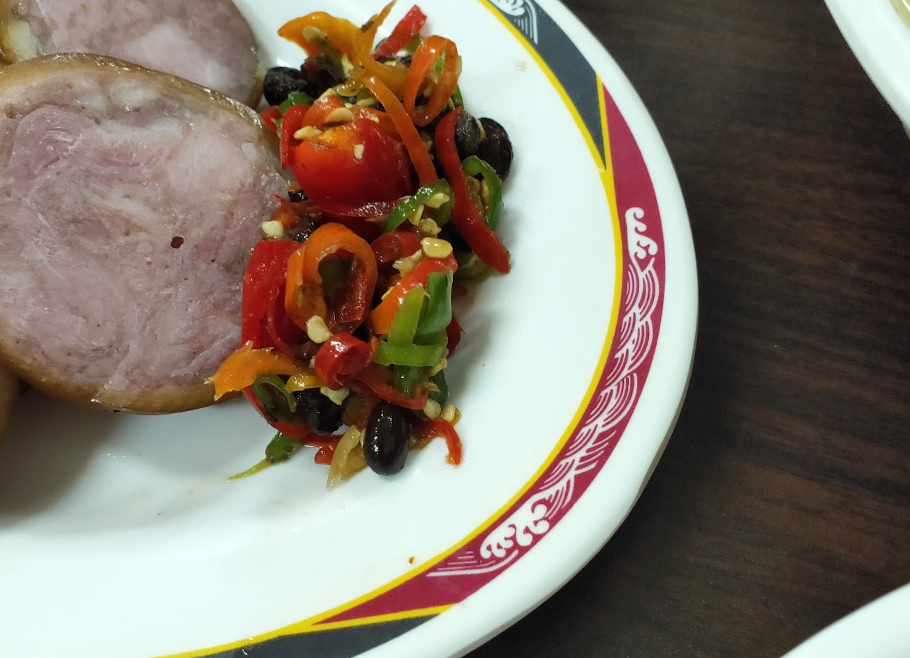 在吃的時候看到桌上有一大桶的辣椒,應該是店家自己炒的,要加的人注意,真的挺辣的,但是看到大家都會拿,像傳球一樣,所以我也加了一些試試,真的不錯